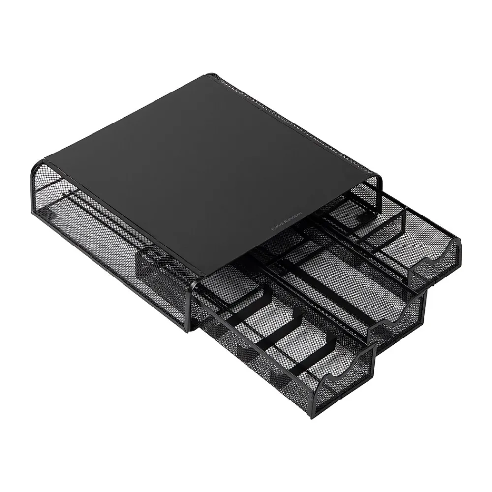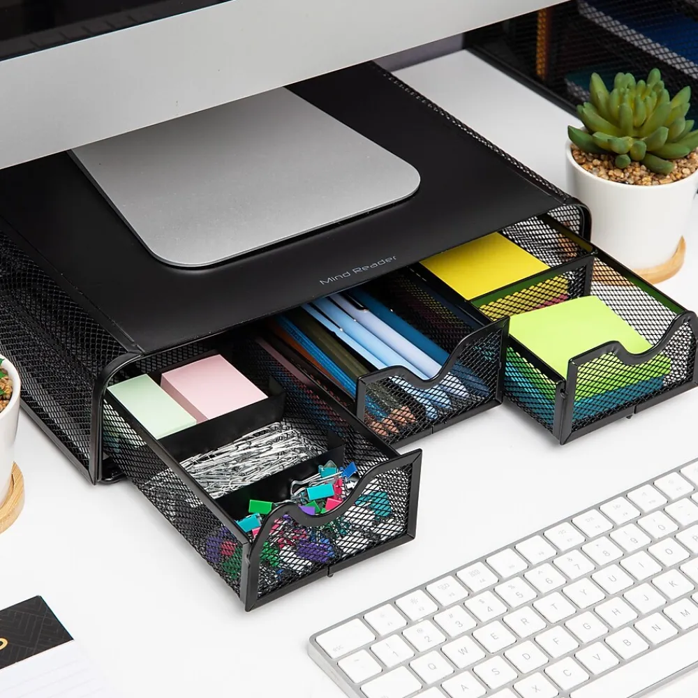 Experience the benefits of an ergonomic monitor stand designed to improve posture, reduce neck and shoulder pain, and elevate your monitor to a comfortable eye level for optimal viewing. This monitor stand not only helps reduce muscle and neck strain but also frees up valuable desk space for increased productivity.Featuring rubber feet for stability and an attractive design, this stand includes a built-in desk organizer with three drawers, offering ample storage for office supplies. Made from high-quality metal mesh, it is strong, durable, and easy to clean for daily use.Measuring 13.25 x 12.5 x 3 inches and weighing 5.5 lbs, this monitor stand can hold a variety of monitor sizes and weights up to 22 lbs. Easily movable and versatile, it makes a great gift for students, those with small spaces, or people who enjoy traveling. Complete your workspace with other Network Collection products for a cohesive, organized look.