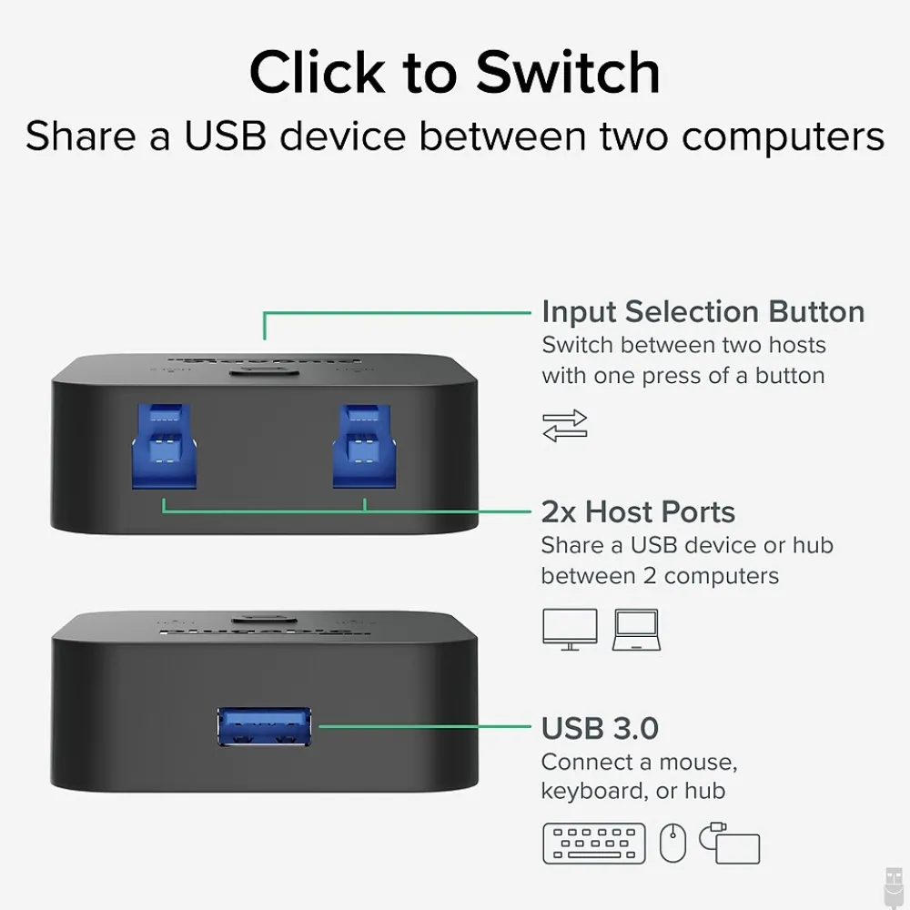 - Save desk space with slim design, 1 “A” port for connecting any USB 3.0, 2.0 or 1.1 device or hub which will be shared/switched