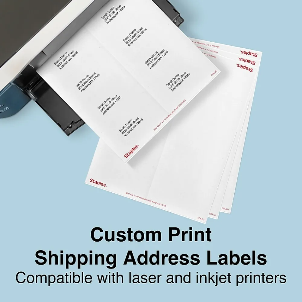 Ensure packages and envelopes are easy to read with these Staples shipping labels. These mailing stickers are coated with permanent adhesive and come in packs of 2,500, making them ideal for high-volume shipping tasks. Customize these Staples shipping labels via a word processing program, and print them with an inkjet or laser printer for a personalized, professional appearance.