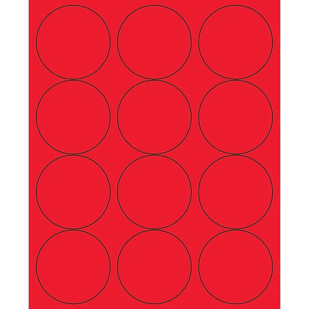 2 1/2″ Fluorescent Red Circle Laser Labels. Use to create your own product or mailing labels. Labels work with both Laser and ink jet printers. Permanent adhesive. Labels stick to a variety of smooth surfaces including paper, corrugated, plastic, wood, glass and metal.
