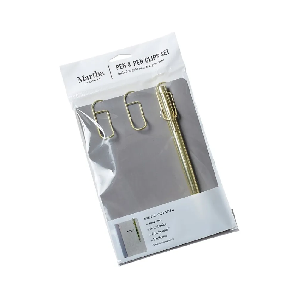 The Martha Stewart pen and pen clip set includes three pen-hanging clips, which you can clip to any Martha Stewart journal to carry your pen around, and a slim gold-tone pen.