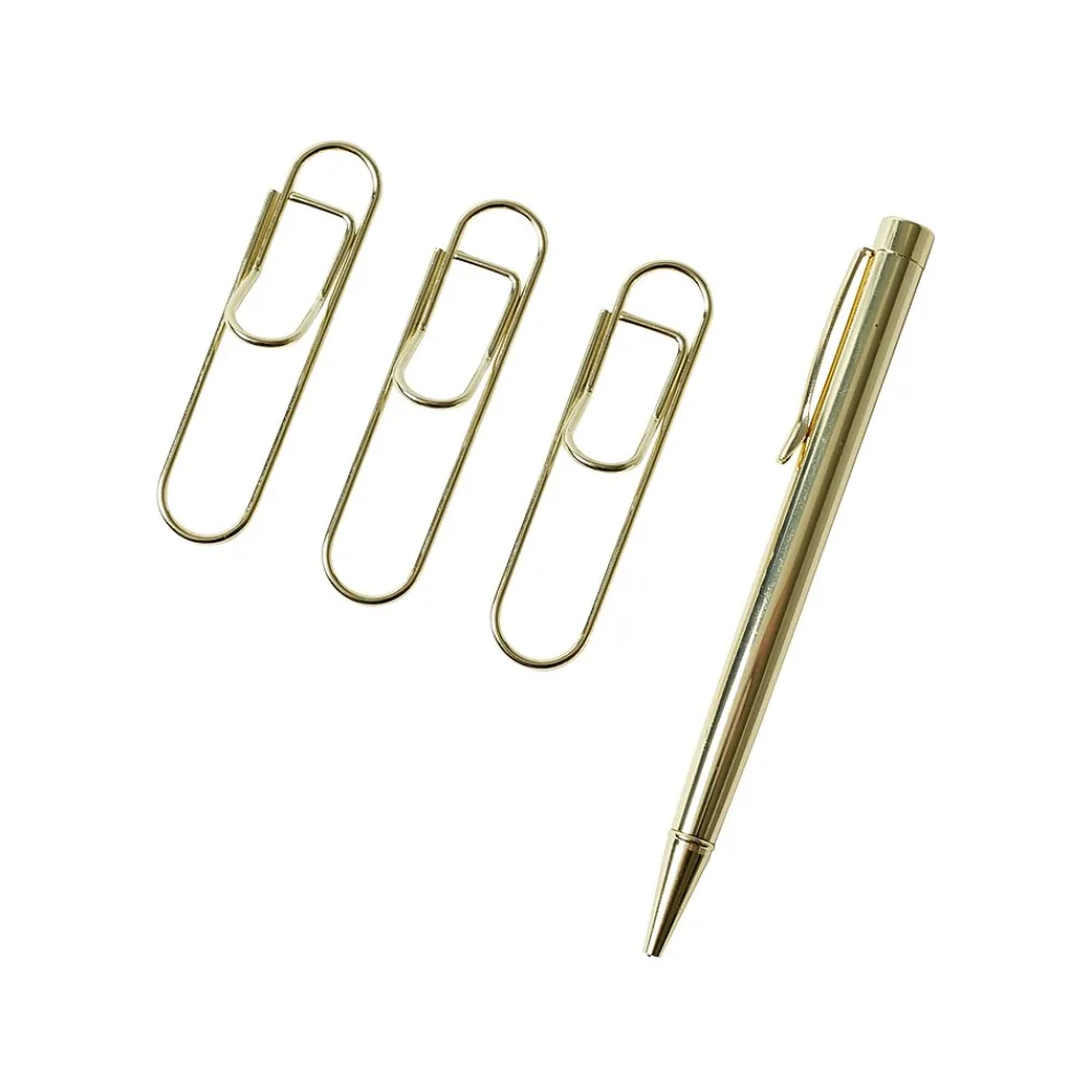 - Includes three pen clips and a slim gold-tone pen