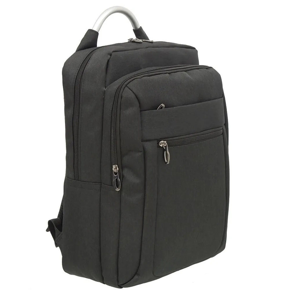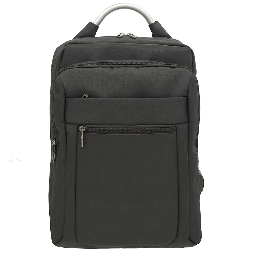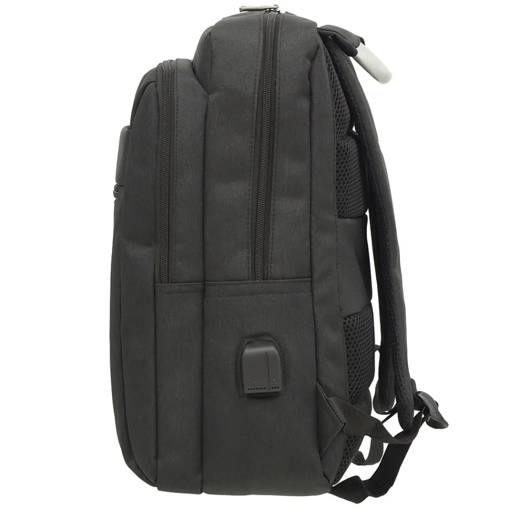 This smart backpack from Club Rochelier features 3 zippered compartments for better organization. Small front pocket stores smaller accessories like your iPad or cell phone. Second zipper pocket is spacious enough for your tablet and sports classification pockets for more organized storage. Main compartment features a secure laptop pocket and a hidden zippered compartment with USB cable and USB/Headphone ports. Comfortable padded backpack straps and Trolley strap makes this bag perfect for the business traveler or busy student.