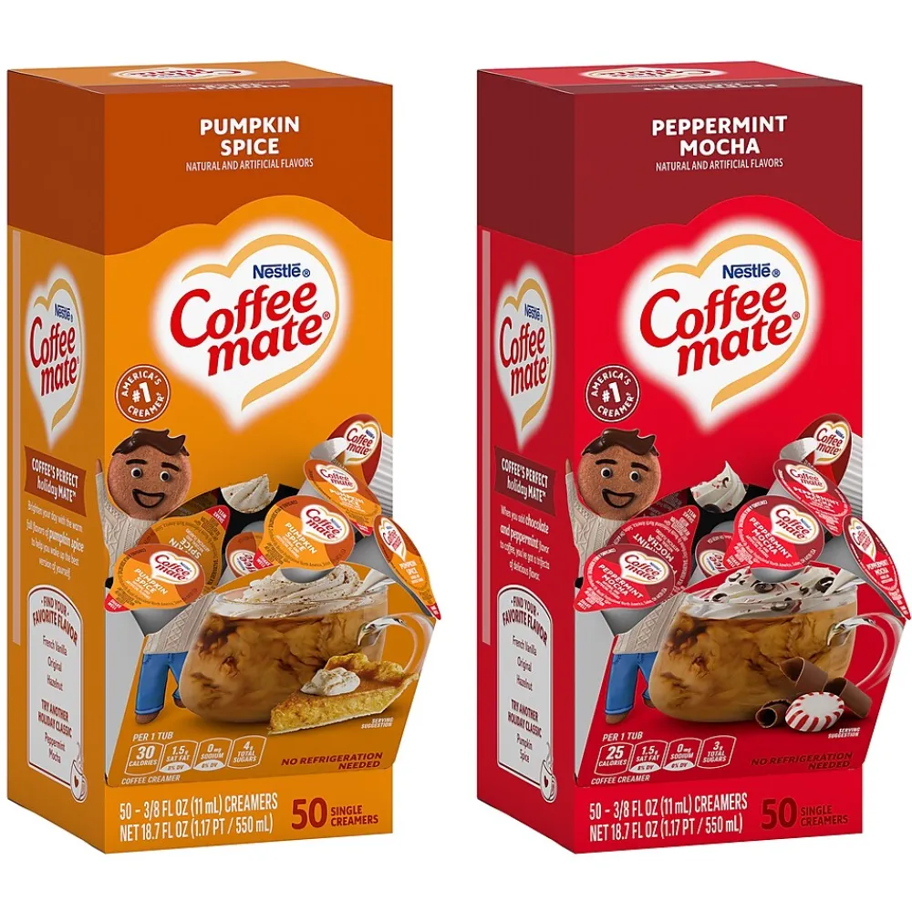 - A 4 count variety pack of Seasonal Coffee Mate creamers with 2 pumpkin and 2 peppermint packs