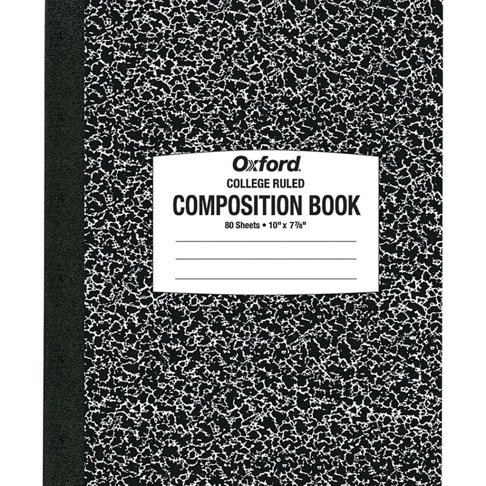 Oxford Composition Books have a classic hardcover format ideal for journaling, lab assignments or notes. Center-sewn sheets keep your pages intact. Black marble cover. 10″ x 7-7/8″. College ruled, 80 sheets.