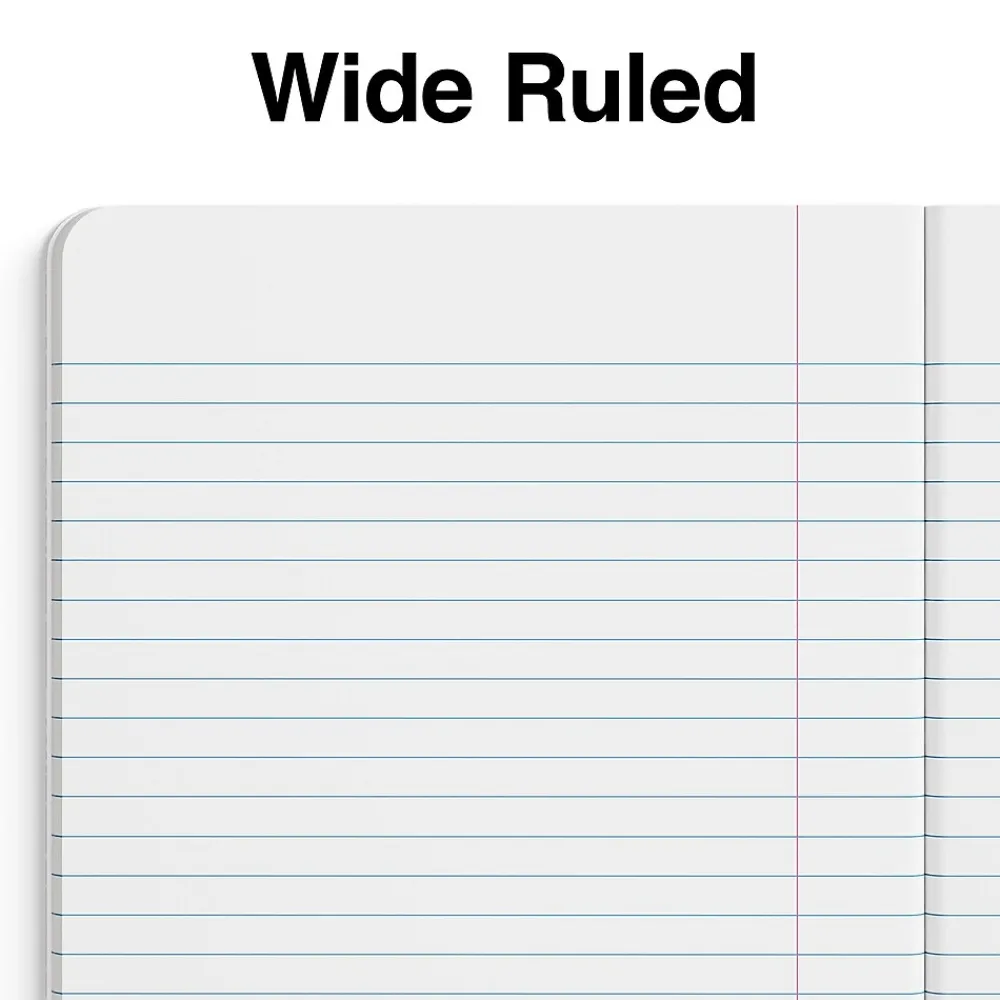 Practice writing and penmanship with this 100-sheet composition book. The wide-ruled pages allow you to write big legible letters, while the standard size makes it easy to keep your notes organized. This Staples 7.5 x 9.75-inch composition book available in assorted colors has a sturdy cover that withstands daily handling, and the high-quality acid-free pages resist yellowing for long-lasting use.