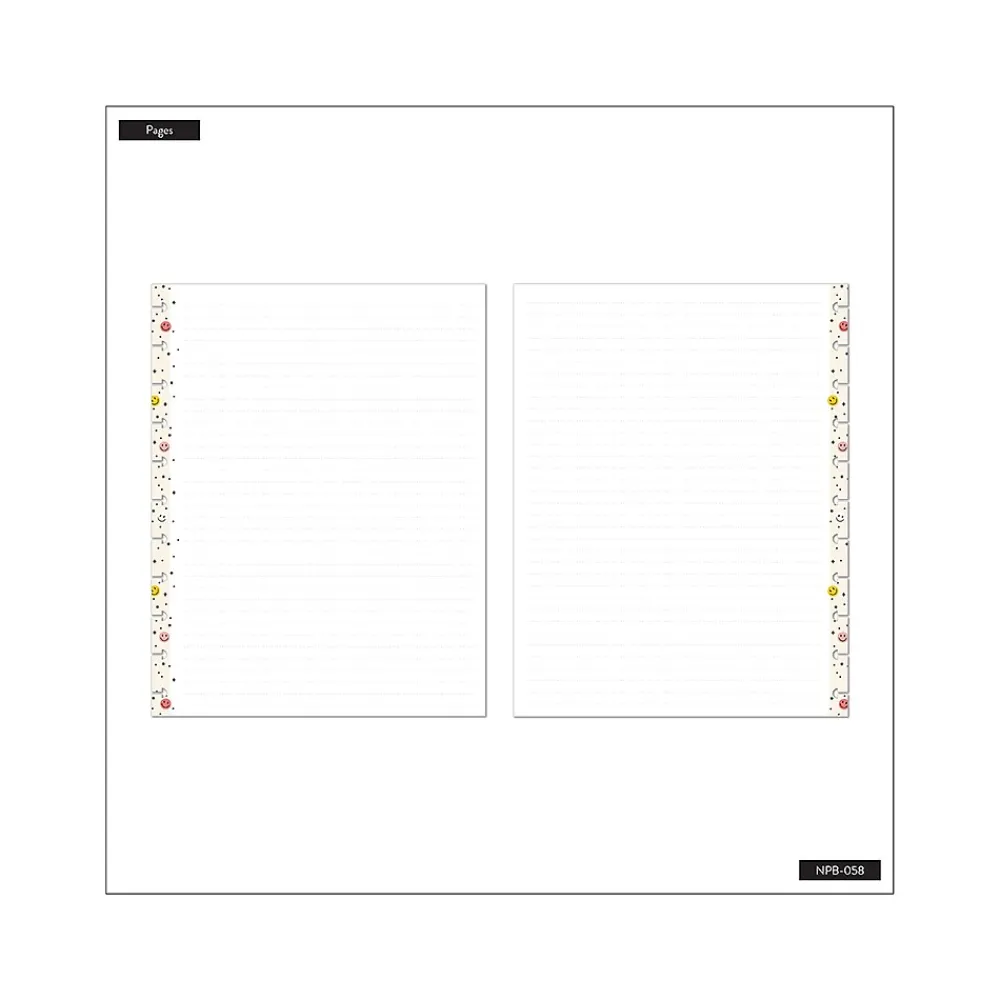 - Features a sturdy laminated cover in beige with a Happy Brights design featuring smiley faces and colorful confetti