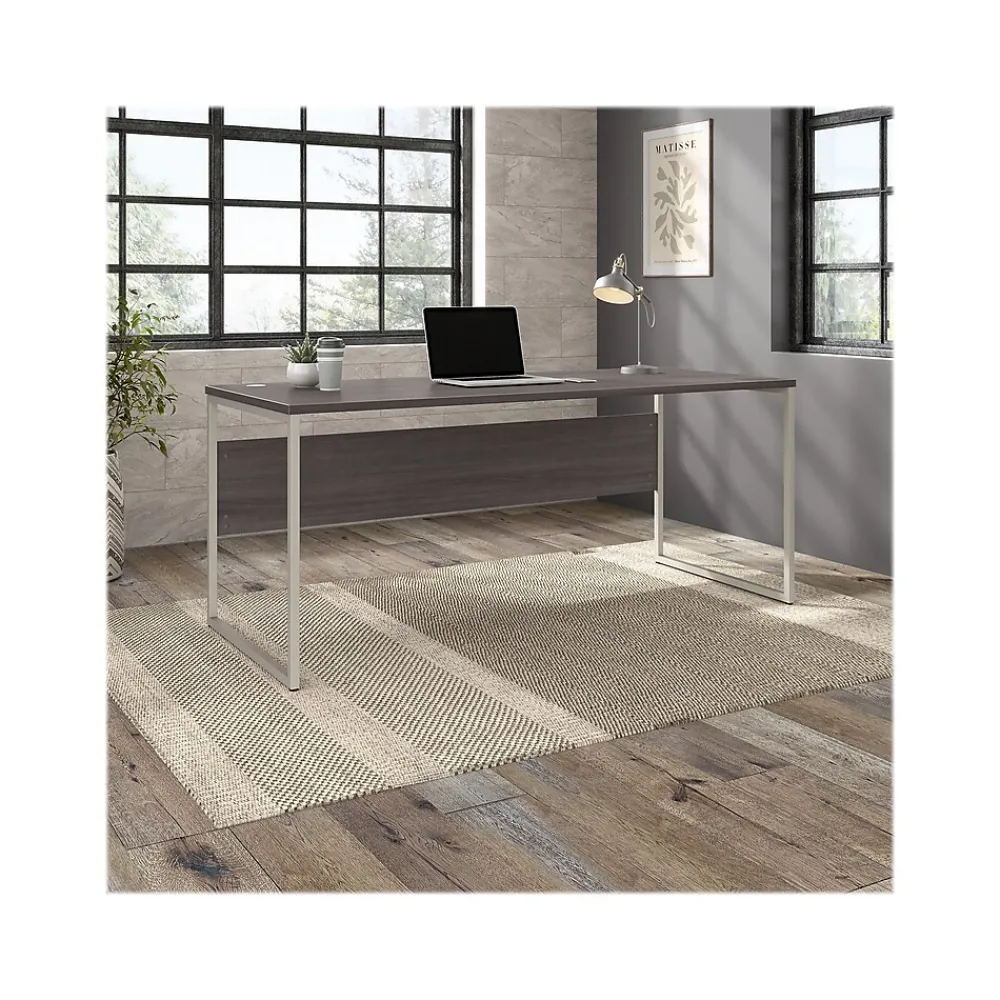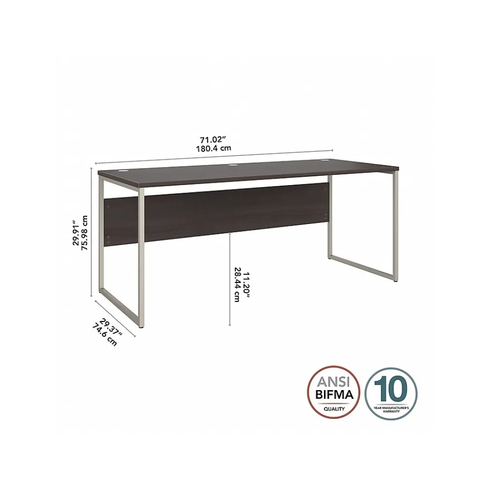 The Bush Business Furniture Hybrid 72″W x 30″D computer table desk blends a durable work surface with sturdy metal legs to offer a stylish, long-lasting solution for the modern professional. Tackle your next project or assignment with a computer, books, paperwork, and more on a desktop that supports up to 200 lbs. A built-in wire management grommet keeps cords and cables in order, so your work area remains free from unnecessary clutter. The computer desk’s open leg design and finished privacy panel allow it to look great facing any direction in a home or professional office environment. Find the perfect look for your space with five contemporary finish options: black walnut, modern hickory, platinum gray, storm gray, and white. This modern desk has been meticulously tested to meet or exceed ANSI/BIFMA quality standards for safety, durability, and performance and is backed by the Bush Business Furniture 10-year manufacturer warranty. See the full Hybrid collection for coordinating items to enhance your workspace as needed, including file cabinets, bookcases, and storage cabinets (coordinating items sold separately). American-made with US and imported parts.