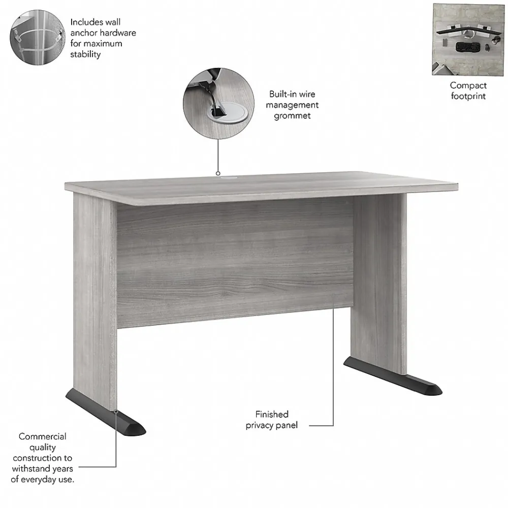 The Bush Business Furniture Studio A 48″W computer desk with three-drawer mobile file cabinet combines a fresh contemporary appearance with the commercial-quality construction needed to withstand years of everyday use. Set up with a computer and equipment on the durable thermally fused laminate desktop that supports up to 200 lbs. A built-in wire management grommet keeps cords and cables in order, so the surface remains free from unnecessary clutter. The file cabinet’s bottom drawer accepts letter-, legal-, and A4-size paperwork, while two box drawers organize supplies. The two bottom drawers can be locked to protect sensitive files and personal items. This small desk with drawers has been meticulously tested to meet or exceed the ANSI/BIFMA standards for safety, durability, and performance and is backed by a 10-year manufacturer limited warranty. American-made with US and imported parts.