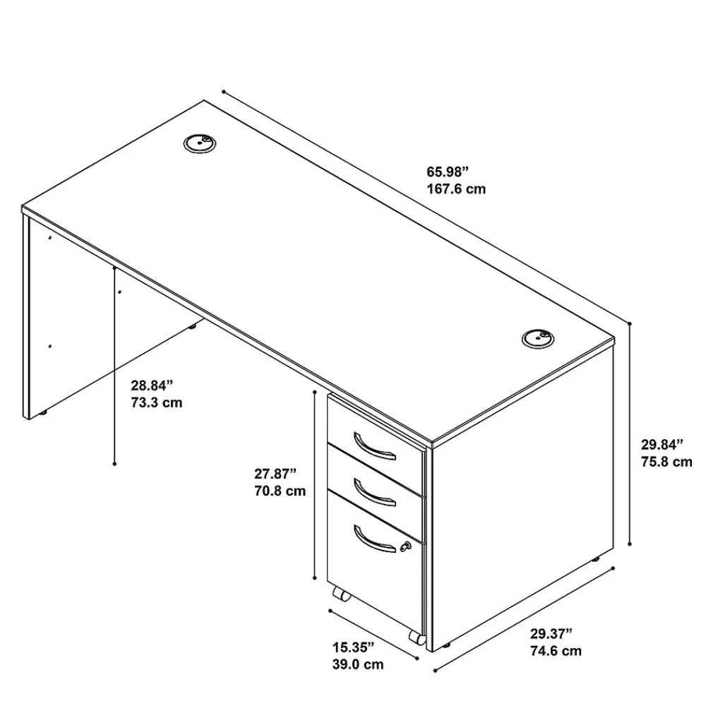 Enjoy a professional look, convenient features and long-lasting commercial quality with the Bush Business Furniture Westfield 66W Office Desk. The thermally fused laminate finish, rugged edge banding and heavy-duty design provide reliability you can depend on for years. Integrated wire management organizes your cables for a clutter-free surface. Brushed Nickel hardware, extended modesty panels and clean lines create a lasting impression. Roll the Mobile File Cabinet wherever you need it, or stash it under the Office Desk for safekeeping. A locking full-extension file drawer accepts your letter, legal and A4 documents for a tidy workspace. Westfield offers endless layout options, expansion opportunities and 7 finishes. This affordable office furniture withstands the rigors of a 40-plus hour work week and comes with a 10 Year Warranty. American made with U.S. and imported parts.