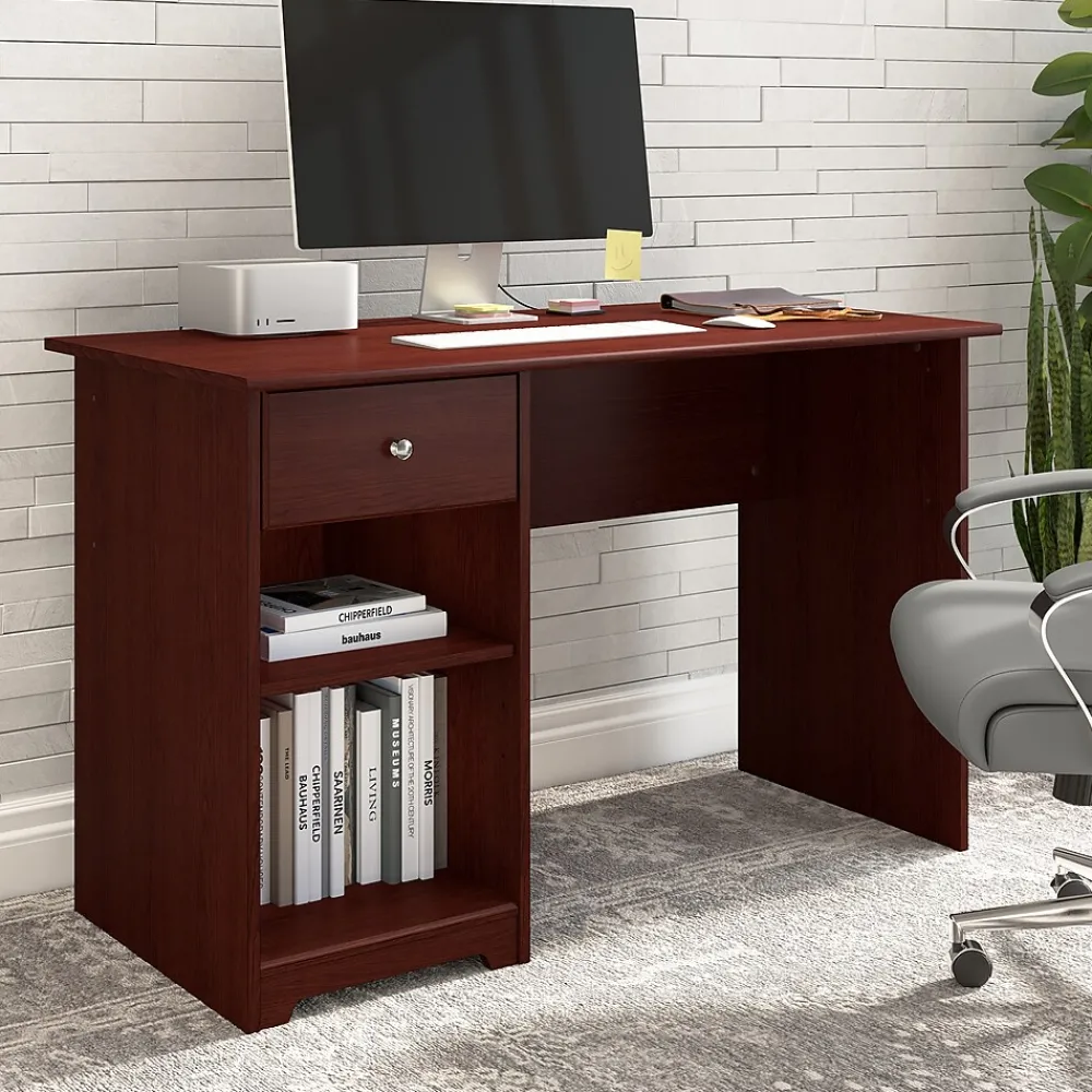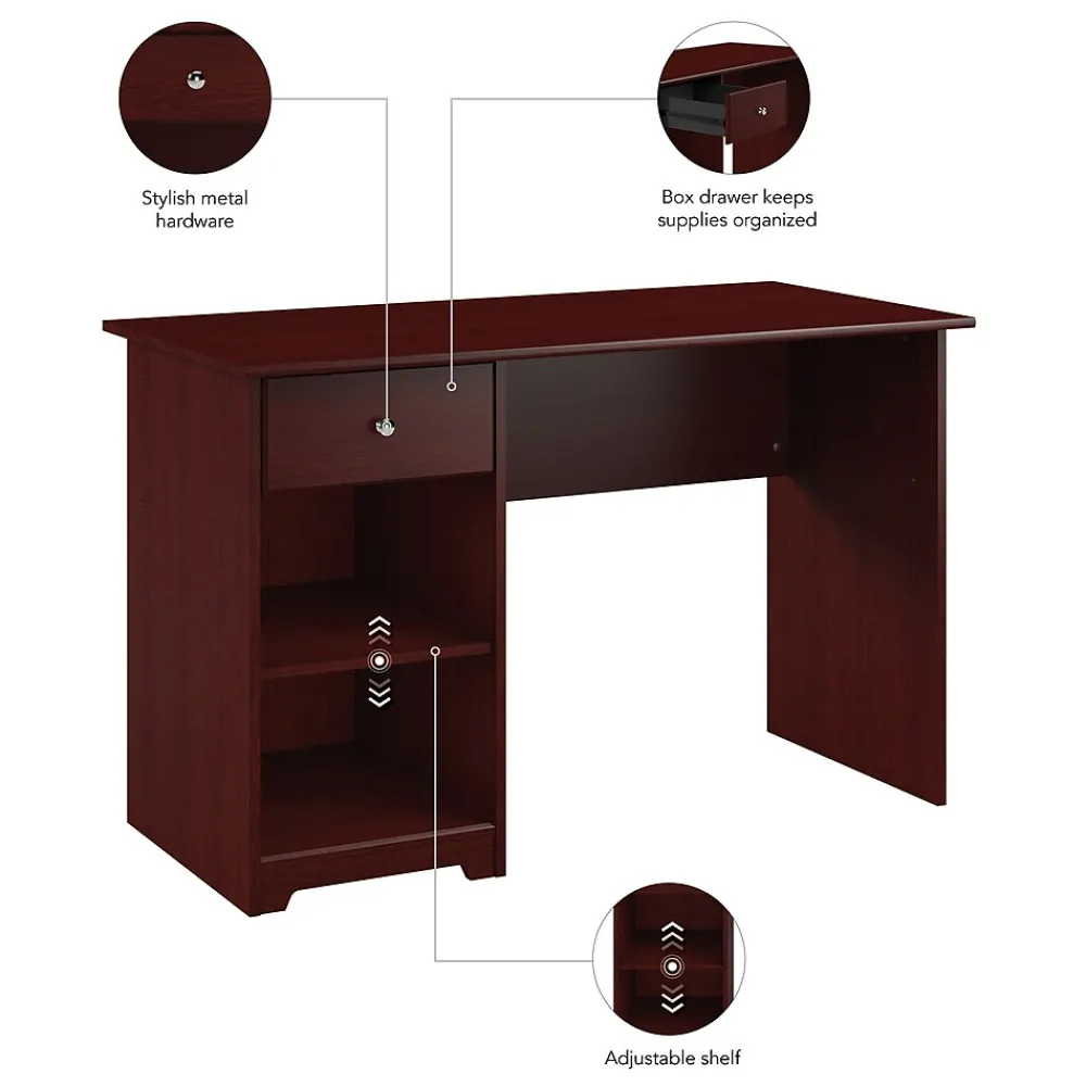 The Bush Furniture Cabot 48W Computer Desk with Storage presents a convenient solution for your home office with transitional style. The compact work surface is perfect for small spaces while still offering plenty of room to complete assignments. Take advantage of the durable desktop to spread out while taking on your daily tasks. A box drawer allows you to organize writing utensils and small office supplies. The open compartments are perfect to store frequently used materials and office equipment. The computer desk is finished on all sides to look great facing any direction. Stylish metal hardware complements your choice of finish for an appearance that works with your own space and taste. This desk with storage has been rigorously tested to meet or exceed ANSI/SOHO quality standards for safety and performance and is backed by the Bush Furniture 1 Year Manufacturer’s Warranty.