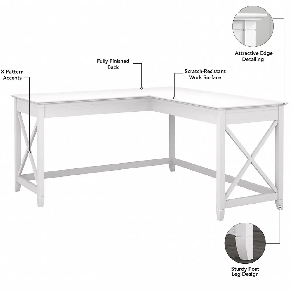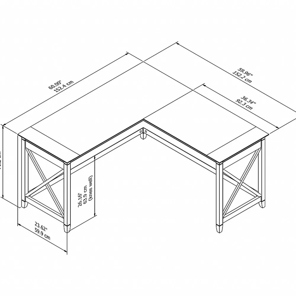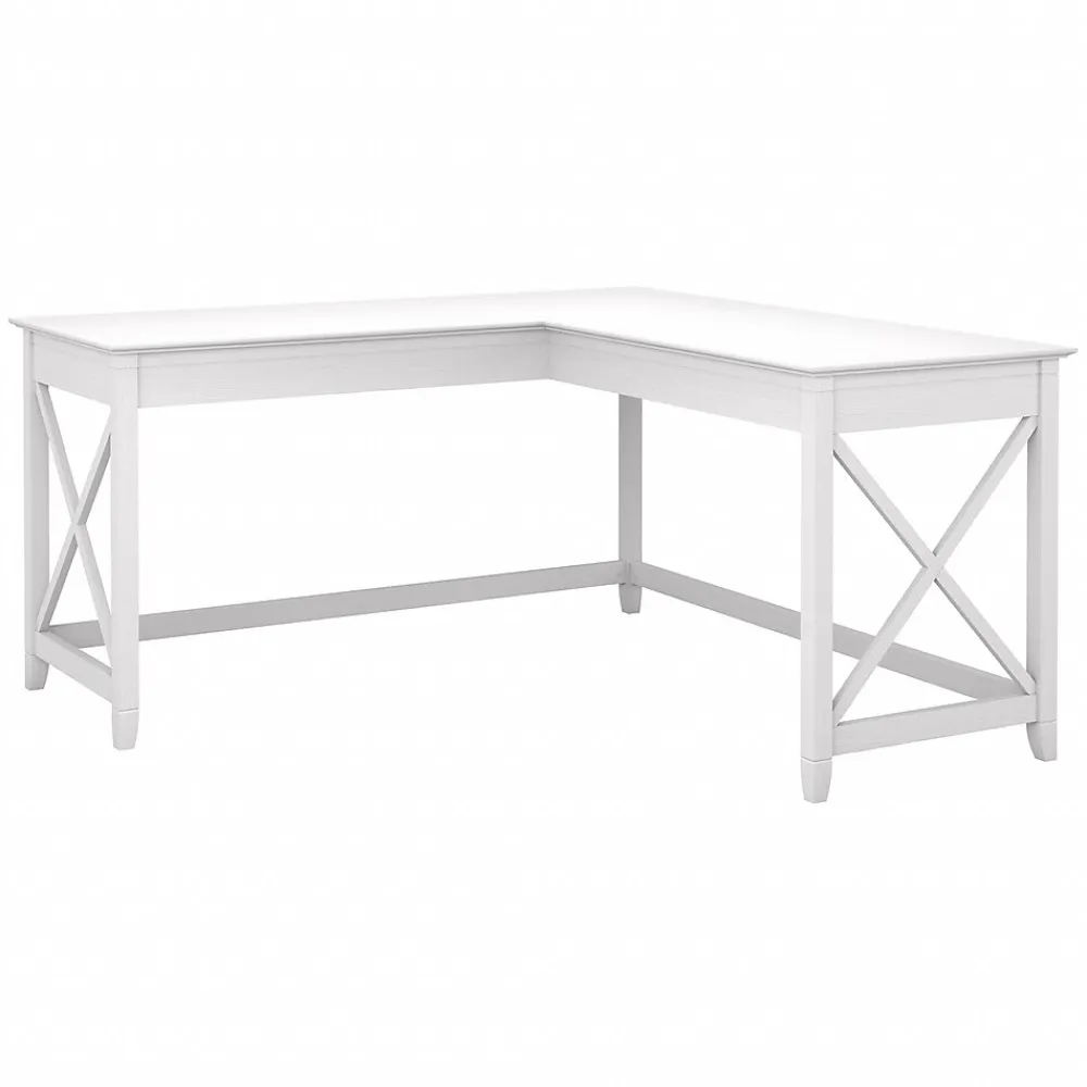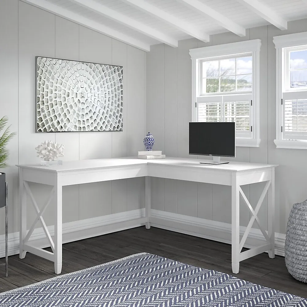 The Bush Furniture Key West 60″W L-shaped desk features an easy-going style that makes it a perfect choice for your casual home office or living space. Save floor space in compact areas by placing the desk in a corner or make use of the fully finished back to take a prominent position in the middle of the room. The durable work surface is spacious enough to spread out with a computer, paperwork and more when taking on your task of the day or just browsing the web. A sturdy post leg design with unique X pattern accents on the side panels creates a relaxed, open appearance while thoughtful construction and quality materials allow the corner desk to support up to 200 pounds. This L-shaped computer desk is tested to meet ANSI/SOHO quality standards for safety and performance and is backed by a 1-year manufacturer’s warranty. See the full collection for coordinating items available.