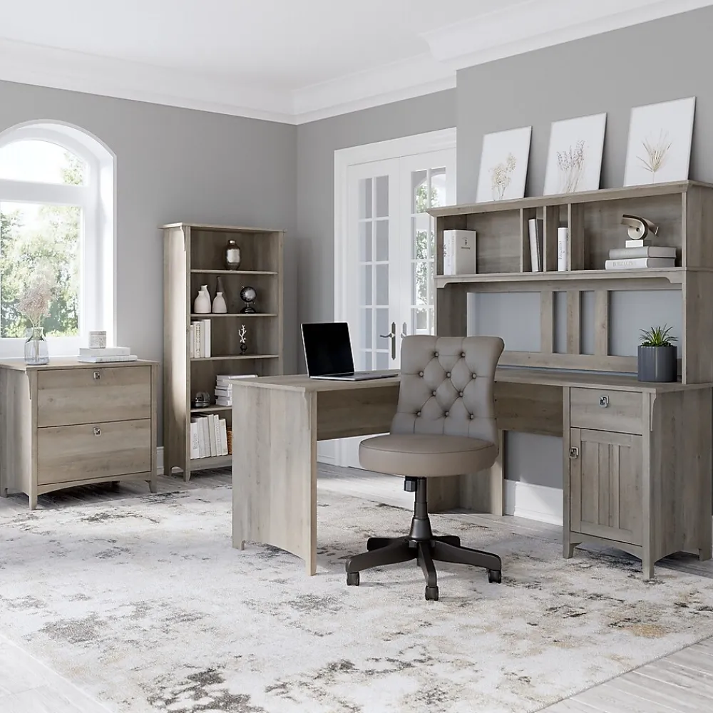Make your home office space comfortable, functional, and beautiful with the Bush Furniture Salinas L-shaped computer desk with storage. Attractive wood details, vertical accents, curved base rails, and tapered legs inspired by Mission styling create a casual look fit for any cottage, family home, or apartment. You’ll love all the room you have to multitask on the L-shaped desk designed to save space in your home with a variety of placement options, including in the corner. The desktop supports up to 200 lbs., so you can get to work with all your materials close by. Store writing utensils and small office supplies in the convenient box drawer and keep larger items in a vertical storage cabinet that features an adjustable shelf. This corner desk with storage is tested to meet ANSI/SOHO quality standards for safety and performance and is backed by the Bush Furniture 1-year manufacturer limited warranty.