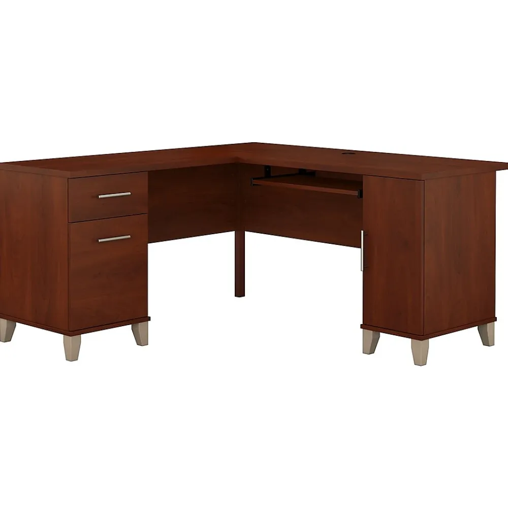 Maximize the potential of your home office with the Bush Furniture Somerset 60W L Shaped Desk. Create your remote work headquarters with space for a computer, phone, printer and more on a surface that features wire management slots for keeping cords and cables in order. A convenient pull-out shelf provides a perfect place to keep a keyboard or laptop, and the Desk also includes a vertical storage cabinet with an adjustable shelf. Place pens, paper and more in the box drawer, and enjoy a file drawer gliding on smooth ball bearing slides for an easy reach to documents. Transitional styling includes a stylish finish with tapered legs and contemporary metal hardware for an alluring appearance. This quality office desk is tested to meet ANSI/SOHO standards for safety and performance and is backed by the Bush Furniture 6 Year Manufacturer’s Warranty. American made with U.S. and imported parts.