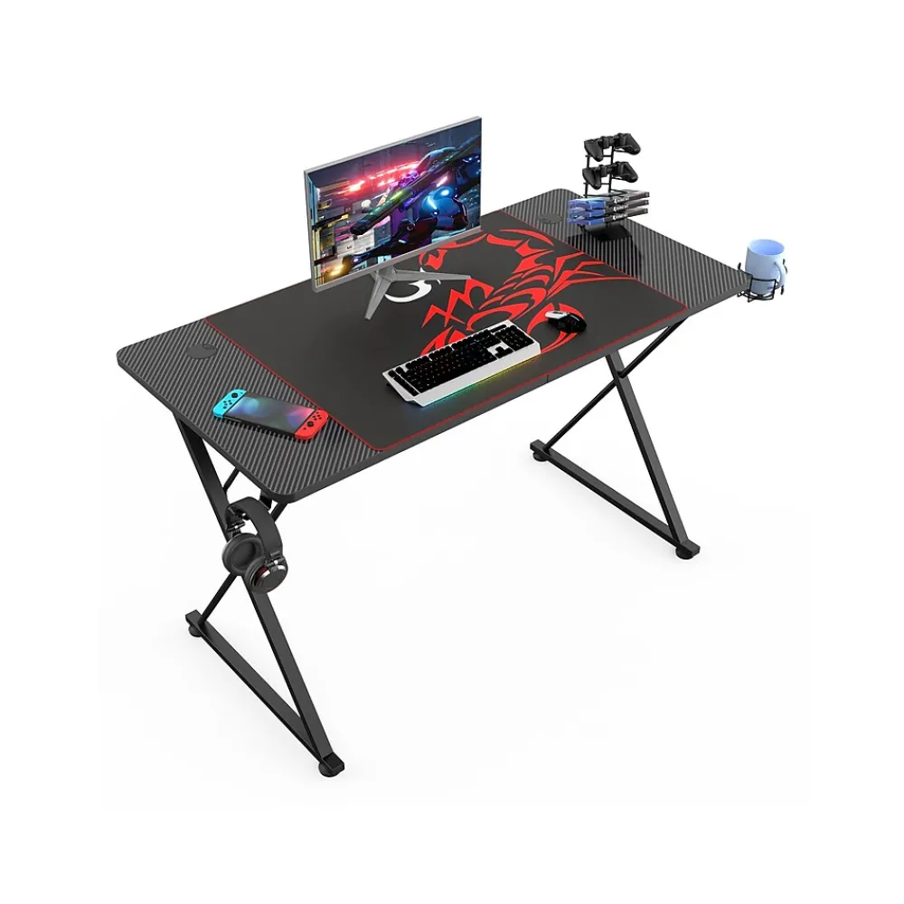 - Base is made of metal for durability and strength, while a carbon fiber texture desktop is made of engineered wood in black finish