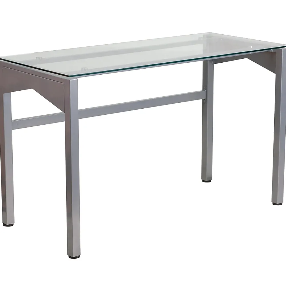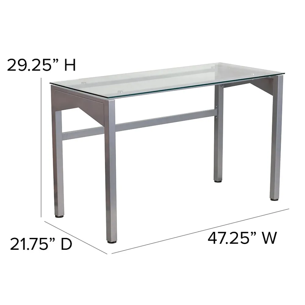 This desk features a clear, tempered glass surface supported by an industrial style, silver powder coated frame with geometric accents on the sides. The generously sized desktop allows you to efficiently manage your workload, while providing ample room for your favorite desk chair. A supportive brace across the rear legs reinforces the frame and complements the stylish lines of the design. Plastic floor glides protect your floors by sliding smoothly when you need to move the desk.