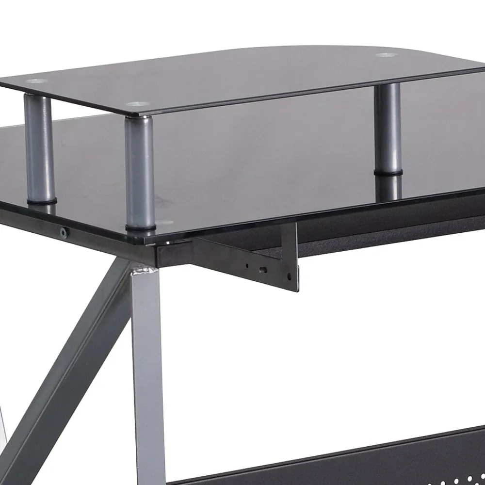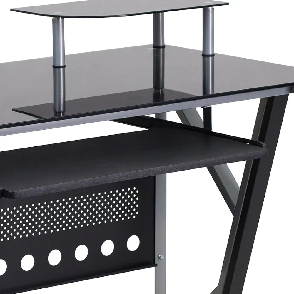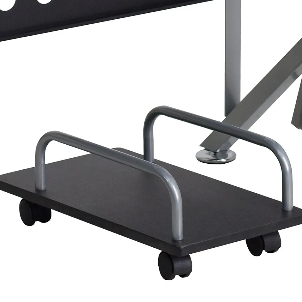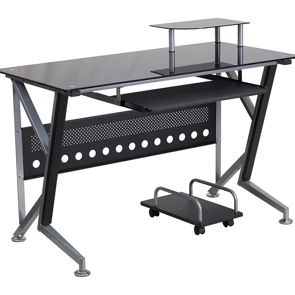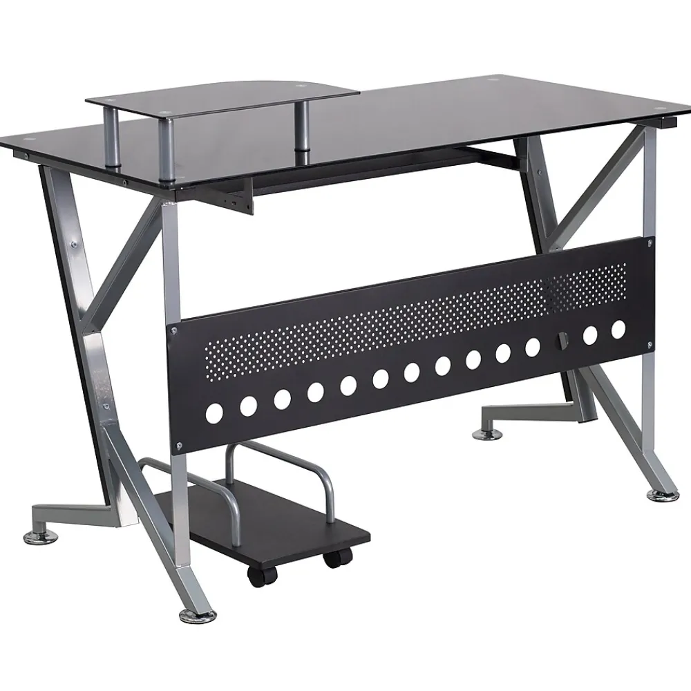 This computer station offers a modern touch with black glass surfaces. Investing in a desk for your home makes working from home or managing household bills and paperwork a nicer experience. The raised monitor shelf gives you more work space for your pa perwork and writing utensils. The pull-out keyboard platform can store your keyboard away when no longer needed for a clean appearance. This desk also features a privacy panel and a convenient CPU cart so you can place it where it suits your needs.