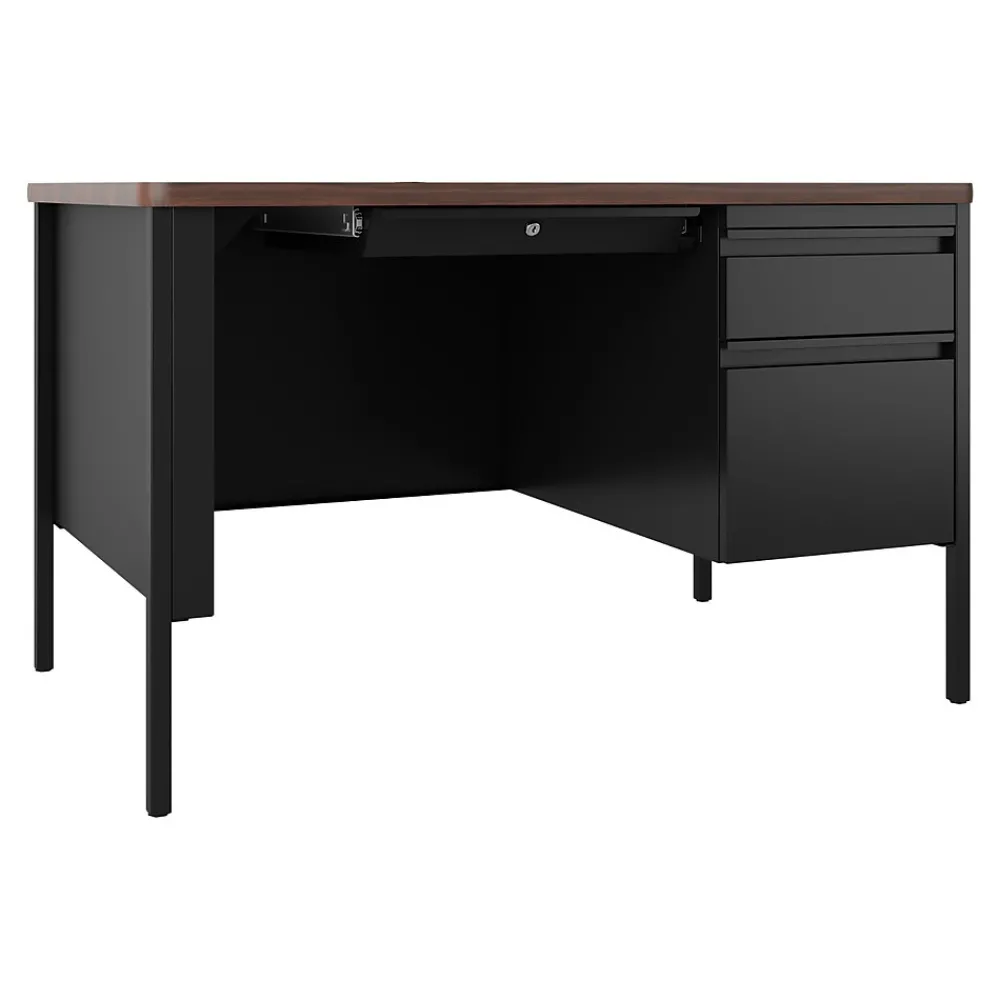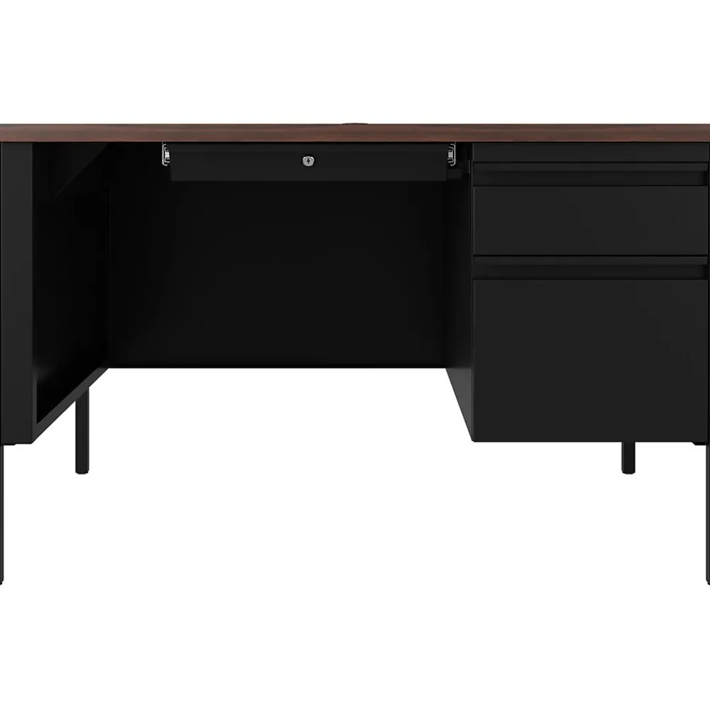 - Modern-style desk is constructed of high-quality steel in black with laminate work surface in a walnut finish