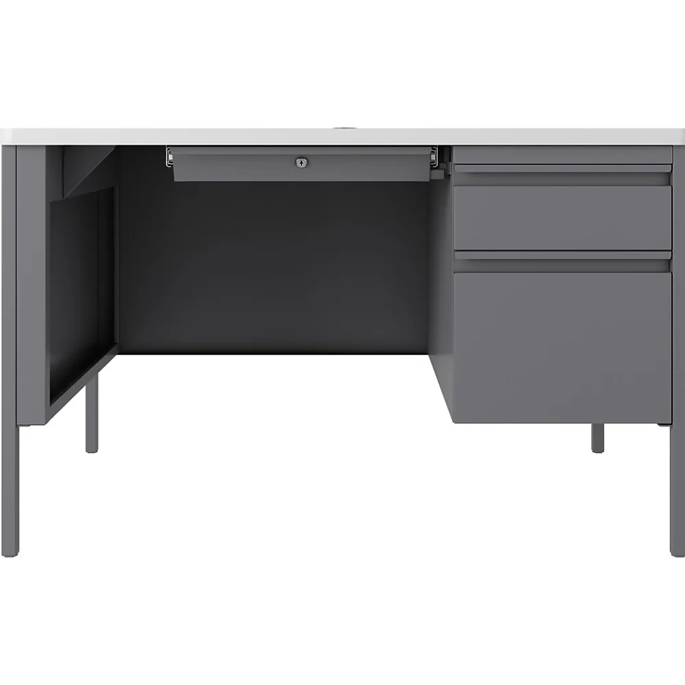 This teacher’s desk is constructed with high-quality steel and materials that are suitable for heavy use. Topped with a durable T-mold laminate designed for the classroom. Standard features include full extension ball-bearing slides for smooth drawer action and a locking center drawer.