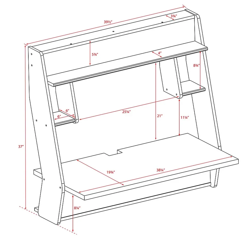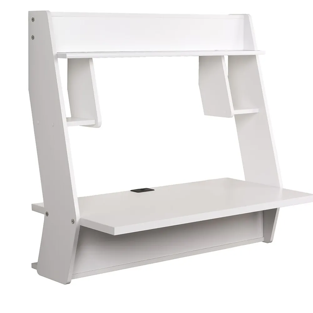 The Studio Floating Desk’s unique modern design provides a stylish workspace without taking up any of your floor space. This desk is perfectly suited for any home office, den, living room, kitchen, dorm room or kids bedroom. The stable 38.25” by 19.75” work surface provides great spot to place your computer, work on homework or read your favorite book.The side compartments provide functional storage for books and media while the top shelf is ideal for photos or your favorite knick-knacks. Installation is a breeze with Prepac’s innovative metal hanging rail system that supports the full weight of the desk plus an additional 80lbs.Manufactured in Canada from non-toxic, laminated composite woods and meets all North American safety standards. Ships ready-to-assemble, includes an instruction booklet for easy assembly and has a 5-year manufacturer’s limited warranty.