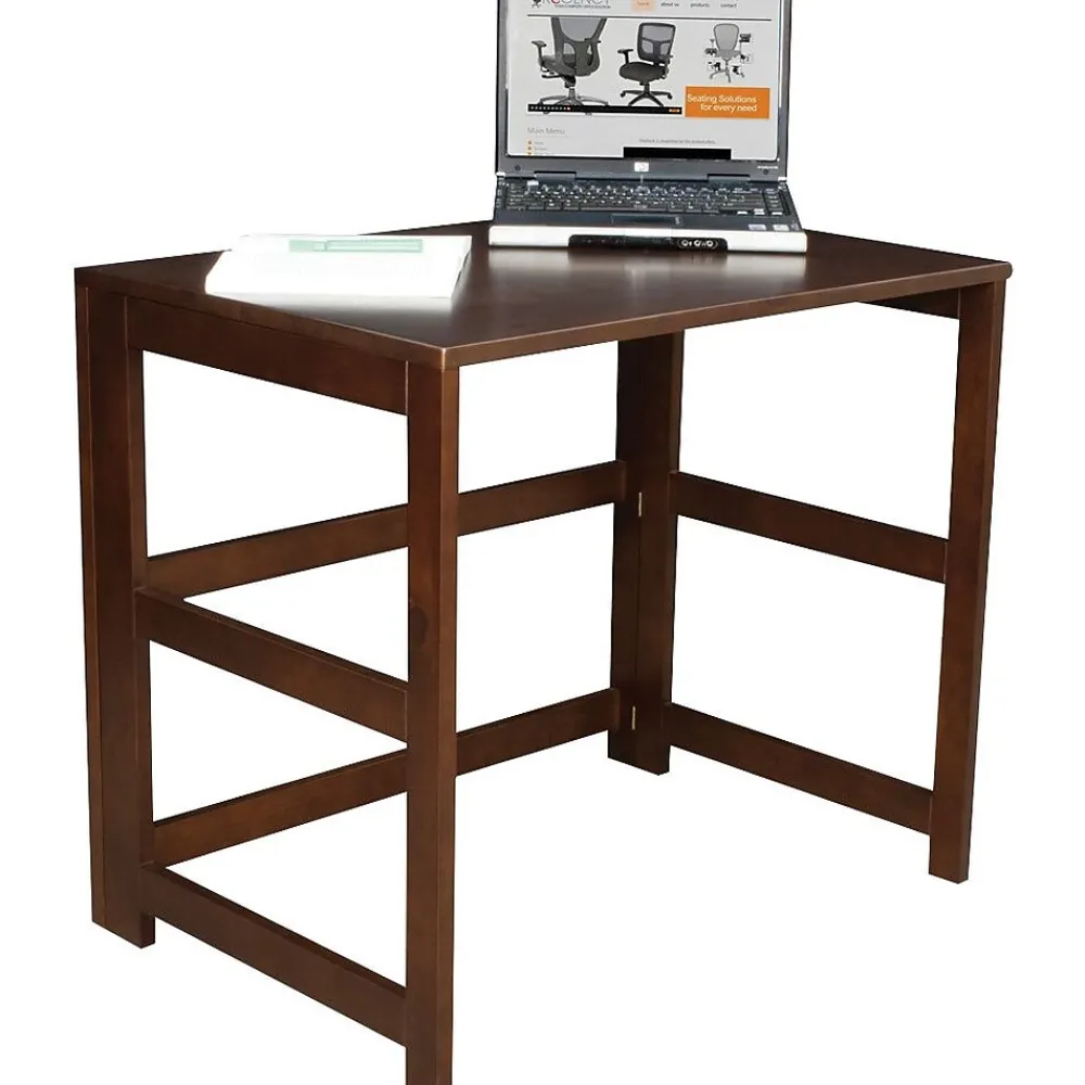 The dorm-room ready Flip Flop collection saves time and money. This Desk unfolds into place right out of the box and assembles in less than 5 minutes. It is constructed of a solid hardwood frame and is finished in a deep Mocha Walnut hand-rubbed veneer. Ships nearly assembled- just attach the top and assembly is finished! Extend the work surface by placing next to a Flip Flop Deskside Bookcase or use on its own for a compact laptop or study desk. Perfect for homes and offices alike, this great desk folds up for easy transportation and storage when not in use.