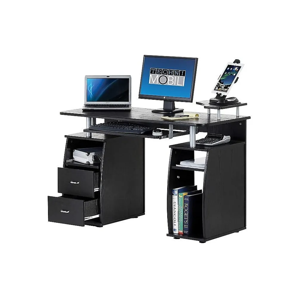 Increase productivity and organization at work with this multi-function computer desk. This desk features two drawers as well as several compartments of various sizes for easy storage and organization of materials. With a durable MDF wood construction, the desktop is resistant to damage from scratches, moisture, and wear. This Techni Mobili computer desk comes in a sleek espresso color, perfect for a home or personal office.