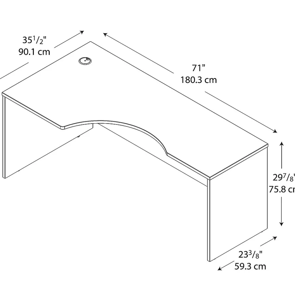Roomy, comfortable and commercial-grade. The Bush Business Furniture Westfield 72W Left Handed Corner Desk provides a lasting professional appearance with clean lines, an extended modesty panel and heavy-duty construction. A comfortable, curved design invites you to lean in and get to work, while a thermally fused laminate finish fends off scratches and stains. Thick end panels and rugged edge banding ensure continued commercial quality. Spread out with paperwork and devices on the spacious surface while concealing cables in an integrated wire management grommet. Use the Left Handed Desk on its own or attach to matching Westfield products to create L and U Shaped configurations. Add a Hutch, Keyboard Tray or Monitor Arm (all sold separately) to complete your office. Backed by a 10 Year Warranty. American made with U.S. and imported parts.