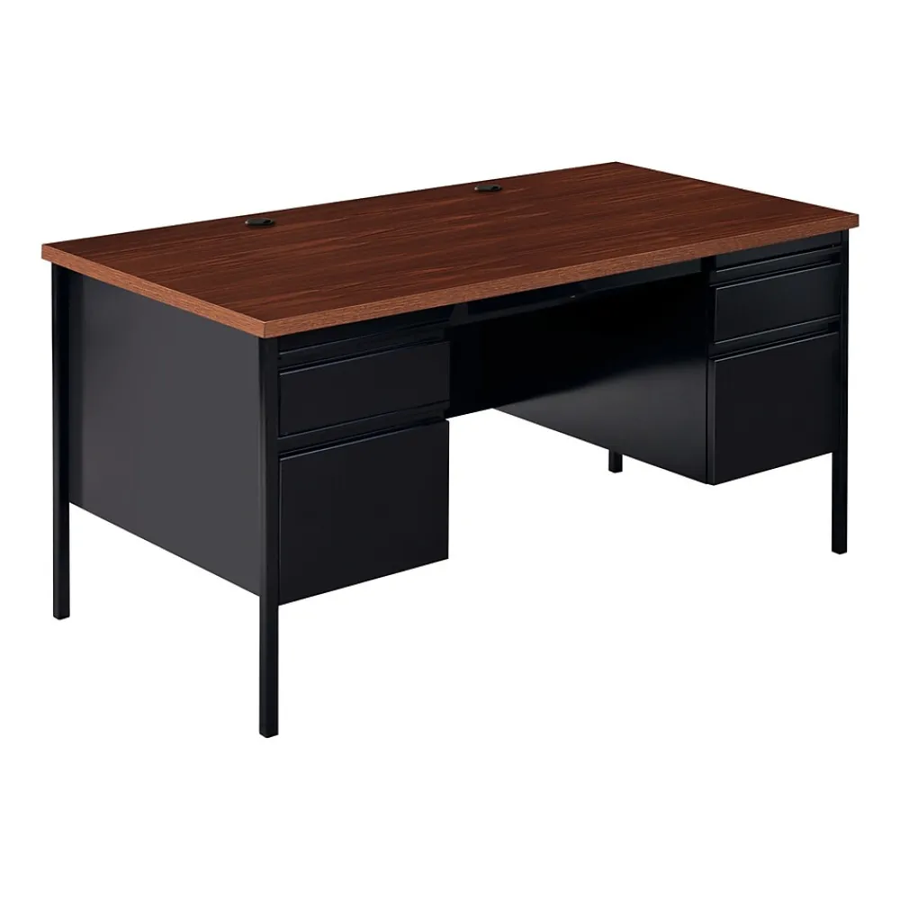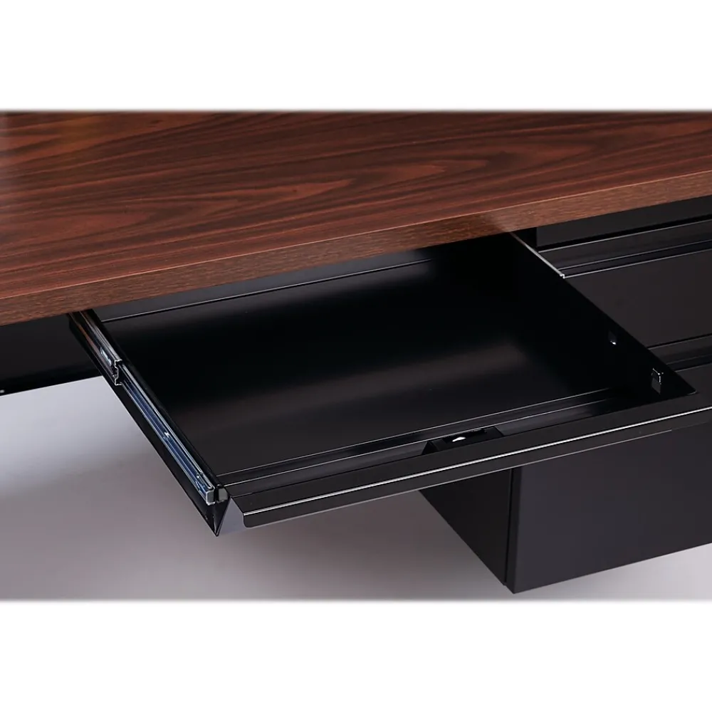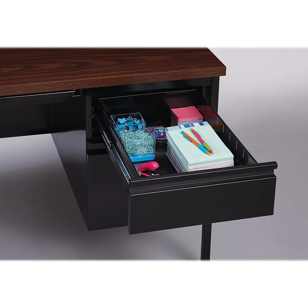Our metal desks are perfect commercial grade desks for business, educational or personal offices. These heavy-duty desks feature steel construction and are suitable for heavy use. Standard features include full extension ball-bearing drawer slides for smooth drawer action, central locking center drawer, and a strong laminate wood top. Our desks ship fully assembled except for the legs. All necessary hardware to attach the legs is included. Our desks are eco-friendly, constructed with 30% recycled materials, and are designed to meet or exceed ANSI-BIFMA industry standards for performance and workmanship. Our commercial desks are also backed by a Limited Lifetime Warranty.