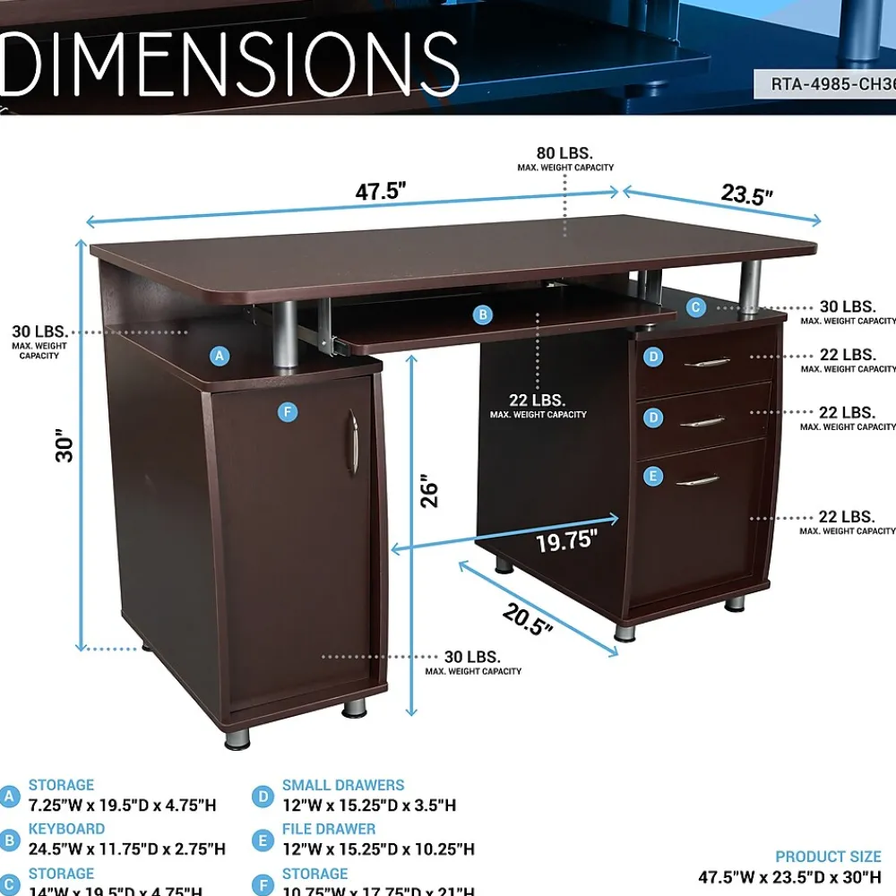 Enhance your productivity and organization in the office with this double pedestal computer desk. Three drawers and a cabinet offer ample space for storage of files and other materials. The desktop features a laminate finish, making it resistant to moisture, scratches and other damage, ensuring long-lasting use. This Techni Mobili computer desk is perfect for a home or personal office.