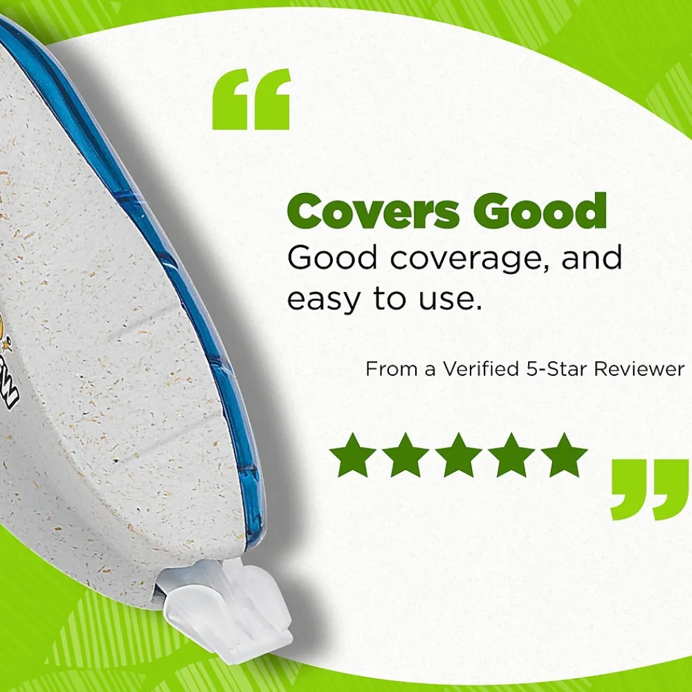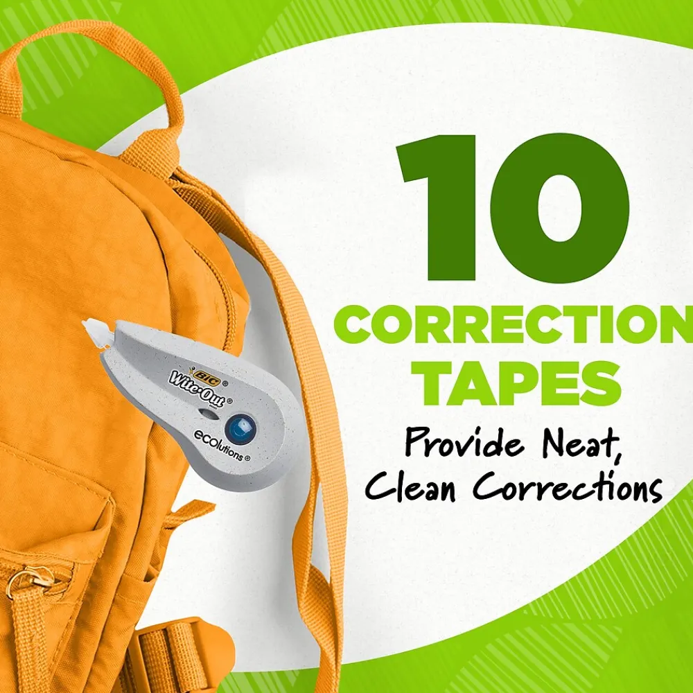 This Wite-Out Brand correction tape is not only made from 56% recycled plastic excluding tape, but the paperboard used in the packaging is made up of 100% recycled content and is recyclable. Each convenient dispenser contains 19.8 feet of white correction tape so you can draw or write safely knowing even if you mess up, there’s a fix. The BIC correction tape goes on dry, allowing you to make instant corrections with no mess and no waiting time, while the convenient size allows hands of all sizes to make quick and accurate corrections. Suitable for lefties and righties, these brightly colored correction tape dispensers are compact enough to fit in any bag so students can easily correct their work. Looking for larger quantities of eco-friendly school supplies? Choose this bulk pack of correction tape, which contains 10 BIC Wite-Out Brand tapes. Pick up BIC Ecolutions Wite-Out Brand correction tape for a high-quality, affordable tape you can trust.