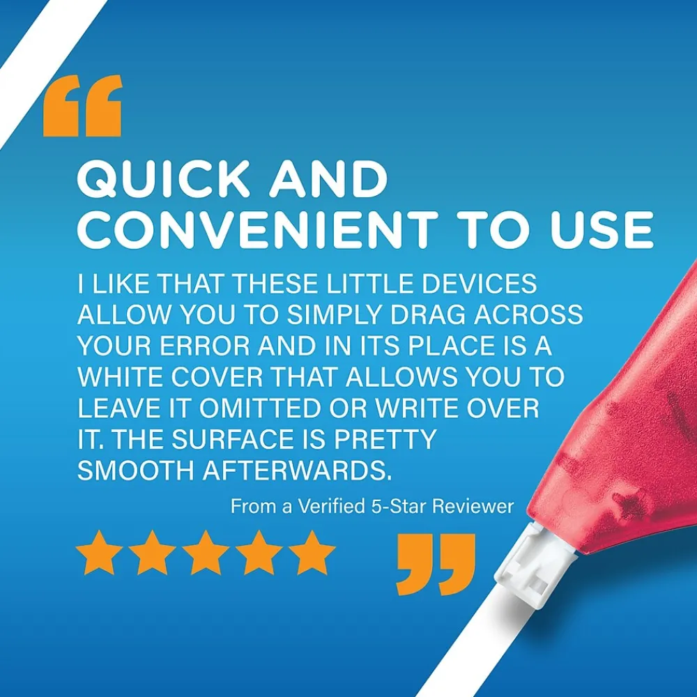 Quickly correct typed or handwritten documents with BIC White-Out Brand EZ Correct Correction Tape. Made by America’s #1 Correction Brand*, this correction tape goes on dry, allowing you to make instant corrections with no mess and no waiting time unlike the correction fluid white out liquid. Dispensing the tape is easy: simply hold the dispenser with your thumb in the groove, position the tip flat on your paper, press down firmly, and gently move from left to right. Offering greater strength than paper-based tape, this film-based correction tape is more tear resistant to create tidy, inconspicuous corrections that last. The self-winding mechanism helps prevent the tape from loosening, so you can apply the tape smoothly and accurately. And thanks to its translucent body, the dispenser lets you see how much tape is remaining.