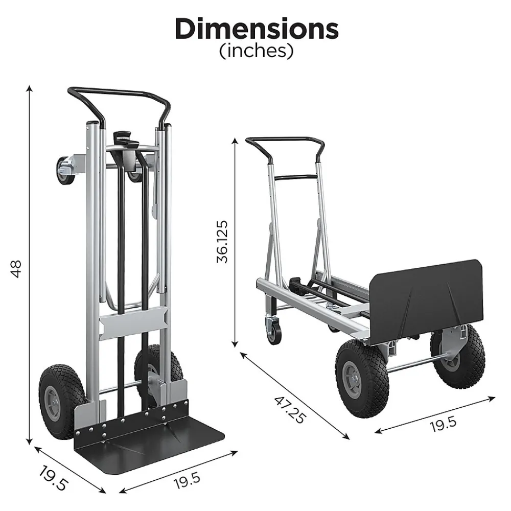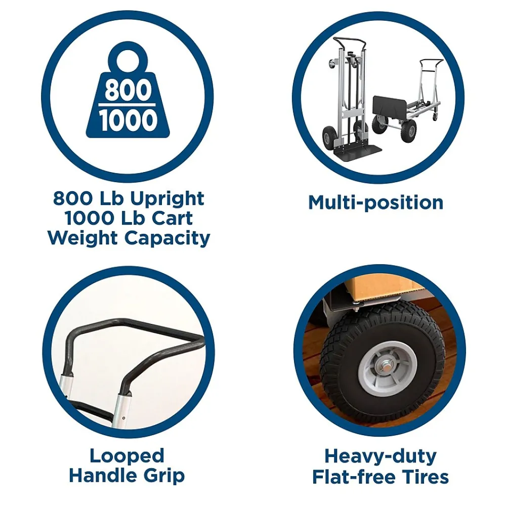 - 1000 lb. load capacity as 4-wheel cart, 800 lb. load capacity as 2-wheel hand truck