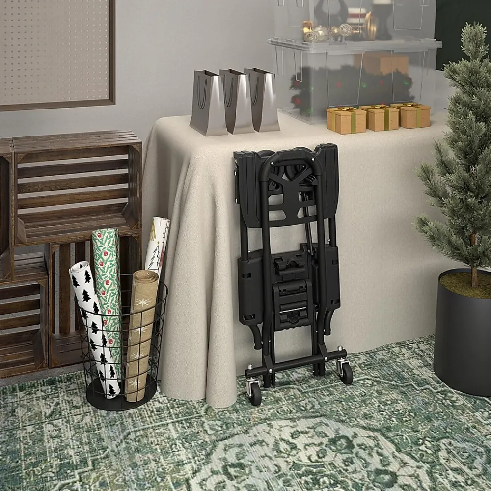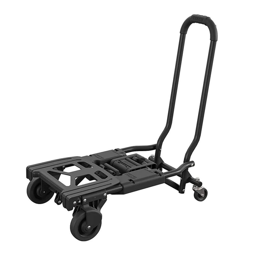 New black color and large toe plate for increased stability! Whether you are moving boxes or unloading the car; simply unfold the COSCO Shifter and let this lightweight hand truck do all your heavy lifting. The Shifter easily converts from its flat storage position to a 2-wheel upright hand truck or 4-wheel cart with no pins or tools. The flat folding design makes it easy to store in a closet, the garage or even the trunk of your car.