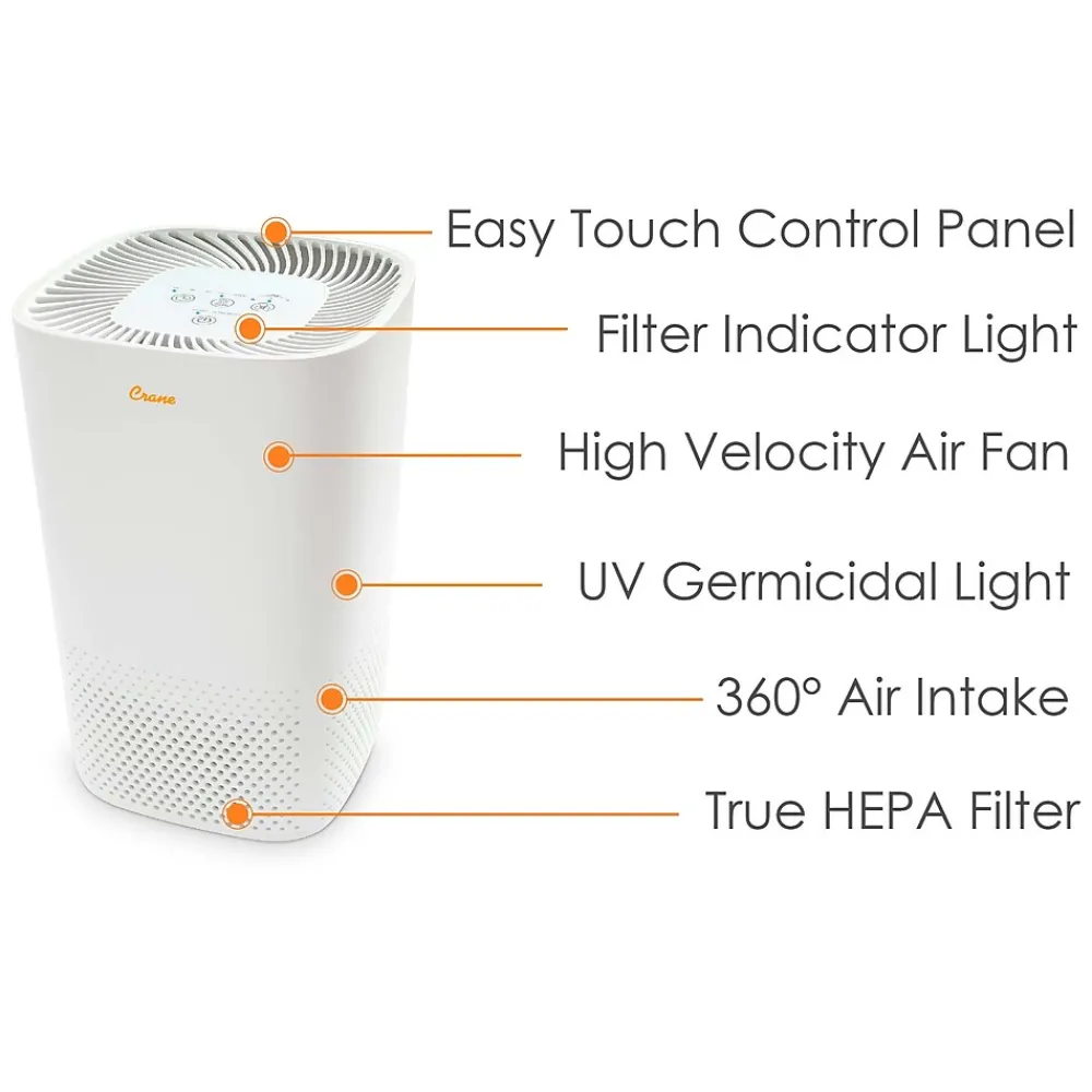 Get comfortable with the air quality in your home with Crane’s innovative standard tower UV air purifier. Crane’s purification system includes a pre-filter, true HEPA filter, and UV lamp. Equipped with a UV lamp, Crane’s standard tower air purifier removes bacteria and germs from the air. With 3 speed settings, and 3 timer settings, you choose how you want to run the show. Crane’s standard tower air purifier provides up to 250 sq. ft. of coverage and will efficiently clean your indoor air by removing pollutants from your home, all the while contributing to your home’s decor.