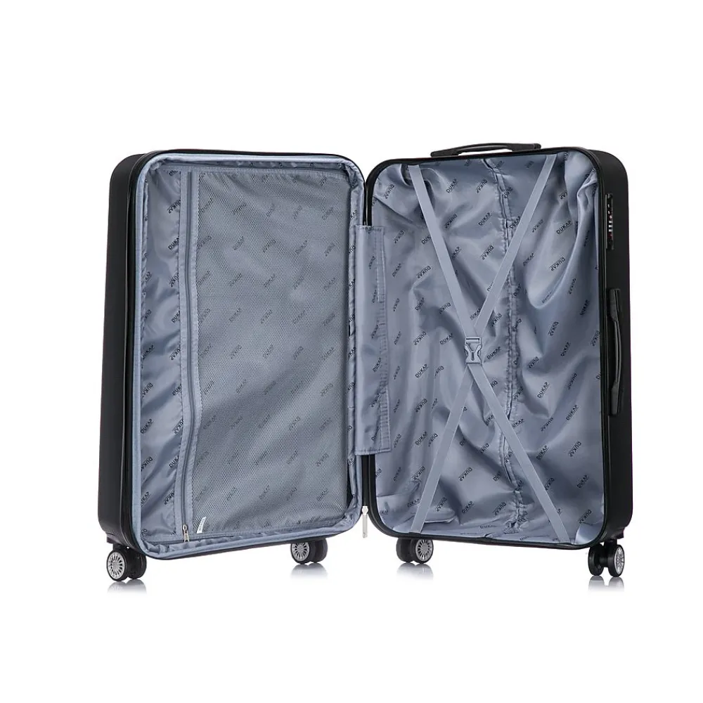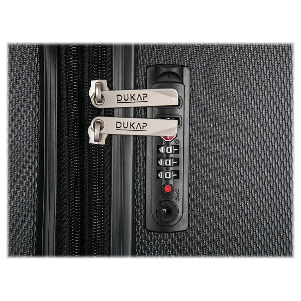 Lightweight PC/ABS engineered material with a micro diamond finish. The hard-flex construction offers maximum strength, durability, and a water-/scratch-resistant finish. The DUKAP CRYPTO suitcase expands 2” for additional extra space. Four dual spinner 360-degree silent wheels allow for effortless mobility. It features the built-in three-digit TSA-approved combination lock ad full interior fabric lining with a zipper compartment on one side and snap-on straps on the opposite side for easy packing, plus one inside pocket. It comes with top and side ergonomic gel handles for comfortable and easy lifting, four side studs that allow the luggage to stand upright, and push-button locking internal retractable trolley system. Smooth-gliding oversized zippers ensure your convenience.