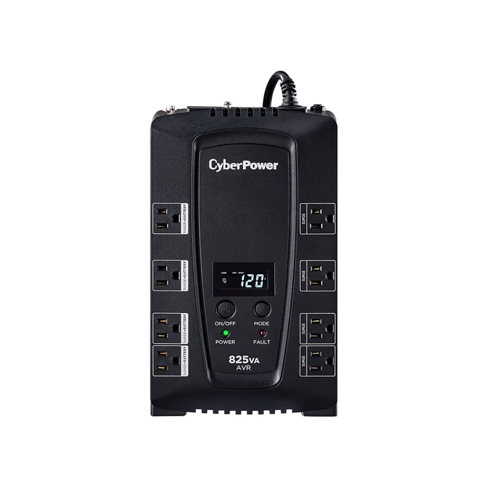 A compact UPS with line-interactive topology, the CyberPower Intelligent LCD CP825AVRLCD provides battery backup (using simulated sine wave output) and surge protection for desktop computers, workstations, networking devices, and home entertainment systems. The CP825AVRLCD uses Automatic Voltage Regulation (AVR) to correct minor power fluctuations without switching to battery power, which extends battery life. AVR is essential in areas where power fluctuations occur frequently. Features include a multifunction LCD panel to provide visibility into power conditions and UPS vitals.