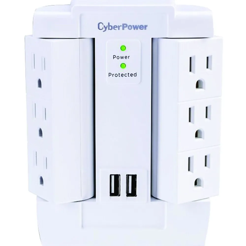 The CyberPower 6-Outlet Swivel Professional Surge Protector Wall Tap with 2 USB Ports is ideal for home or office protection. The surge protector protects personal computers, phones, faxes, modems, printers and more. Its 2 USB ports are perfect for keeping tablets, smartphones and other small electronics ready to use. It features 6 outlets, a wall tap plug, MOV technology and EMI/RFI filters.