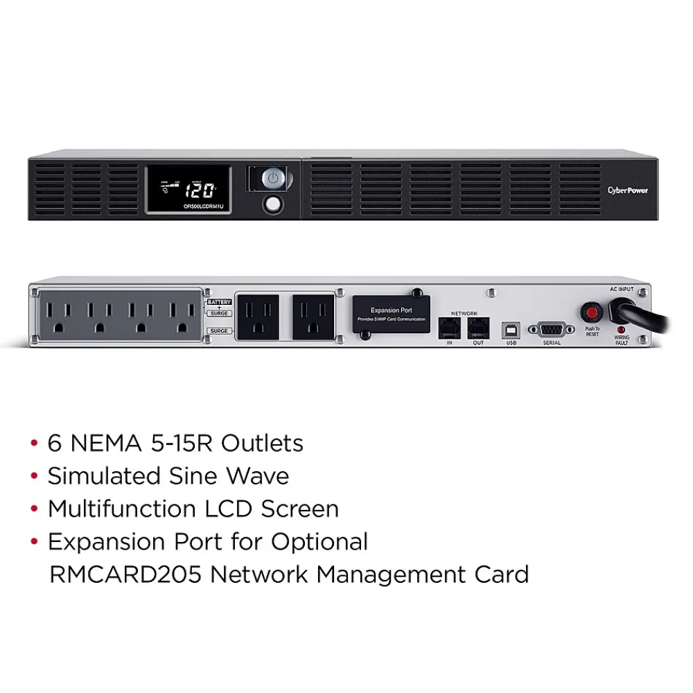 This 1U rackmount uninterruptible power supply (UPS) provides battery backup power and surge protection for connected equipment including servers, network devices, workstations, and telecom installations. Additional features include automatic voltage regulation (AVR) to correct minor fluctuations in utility power without switching to battery mode and a multifunction LCD to keep you informed about power conditions. The UPS also offers remote management capabilities with an optional network management card. The Smart App LCD OR500LCDRM1U comes with a three-year warranty (including coverage of batteries) and a $300,000 lifetime connected equipment guarantee.