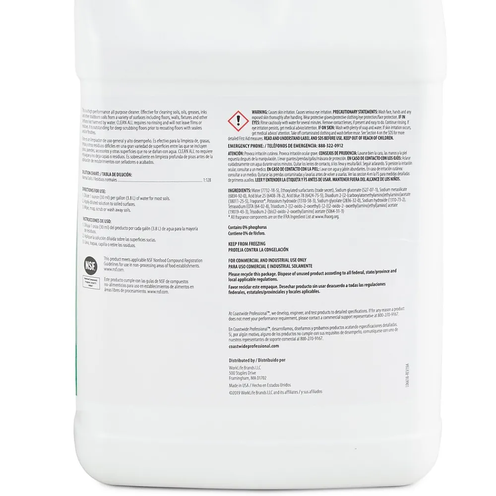 This Coastwide Professional Clean All general purpose carpet spotter and degreaser cleaner is perfect for use on floors, walls, fixtures and most other surfaces not harmed by water. Bulk packaging includes four 3.78-liter containers for cleaning soils, oils, grease, inks and other stubborn soils. Designed for use in a variety of applications including auto scrubbers and pressure washers. Besides, Coastwide Professional Clean All floor finish meets CARB and NSF Non-Food standards.