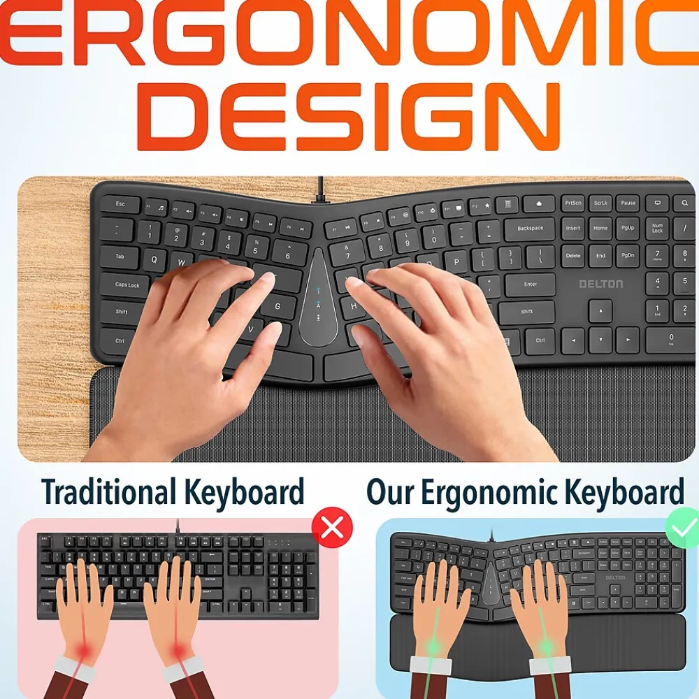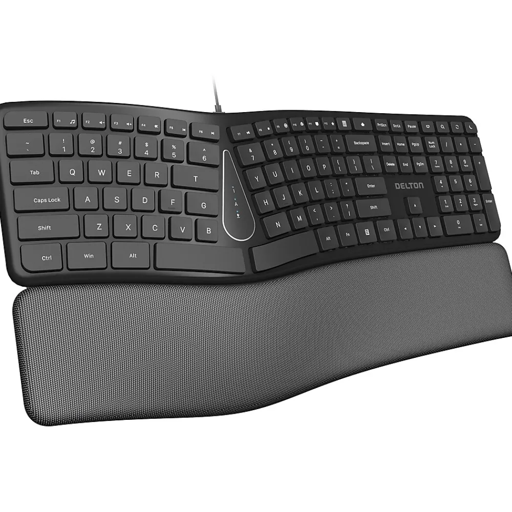 Elevate your workstation with the Delton KB250 computer keyboard, designed to enhance comfort and productivity. This ergonomic keyboard is powered via USB connection, eliminating the need for batteries or separate power sources. The keyboard provides convenient multimedia shortcuts, allowing quick access to volume control, media playback, and other functions. Experience a peaceful work environment with its quiet and curved keys, allowing undisturbed typing. It features a full-size layout with a numpad, providing ample space and convenience for all your typing needs. This wired ergonomic keyboard boasts a curved design that aligns with the natural shape of your hands, promoting a more comfortable typing posture. It also comes with a wrist pad to support your wrists during long periods of typing, reducing strain and discomfort. This silent keyboard offers universal compatibility, effortlessly working with Windows, Mac, PCs, and laptops, ensuring seamless use across different devices.