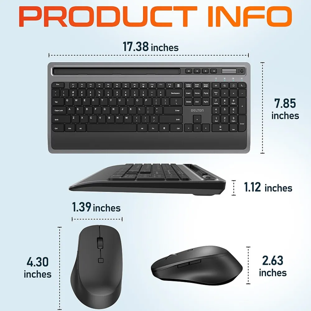 Enhance your productivity with the Delton T42 keyboard and M42 mouse combo, expertly designed for comfort and functionality. The full-sized 114-key wireless keyboard features a slim profile, numeric keypad, and 12 multimedia keys for easy access to shortcuts, while the tablet slot at the top offers convenient multi-device use. Paired with a wireless ergonomic mouse that includes six buttons for efficient navigation, customizable DPI settings (800, 1200, 1600), and precise optical tracking, this wireless keyboard mouse combo is ideal for extended work sessions. Enjoy seamless 2.4 GHz wireless connectivity with a 30ft range for both devices using a single USB dongle, ensuring clutter-free convenience. Both devices feature auto power-saving modes to extend battery life, making them energy-efficient and reliable. This wireless computer keyboards and mouse is a versatile, durable solution, built for quiet operation and broad compatibility with PCs, laptops, tablets, and various operating systems.