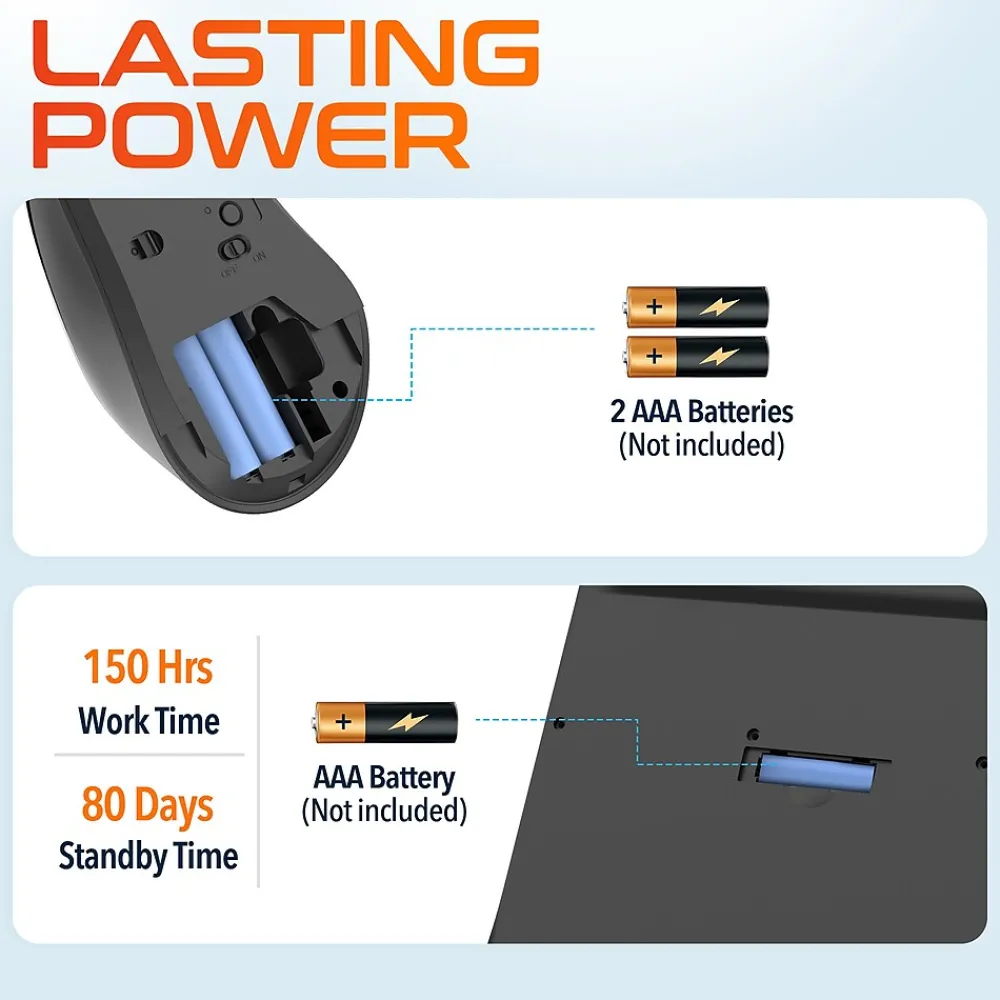 - The ergonomic keyboard requires 1 AAA battery (not included), while the mouse uses 2 AA batteries (not included) with both devices having auto power-saving mode, which activates after 10 minutes of inactivity.