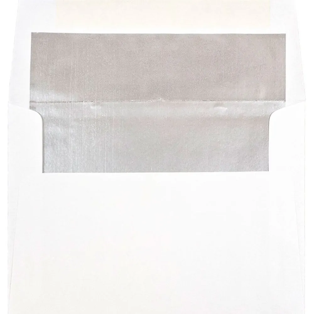 JAM PaperĀ® White A6 Envelopes with Silver Foil Lining measure 4.75 x 6.5 inches in size and are made out of high quality, 24lb paper. Each one of these envelopes features a white color and a beautiful silver foil lining on the inside. This pack contains a total of 25 envelopes. Each one has a straight flap and a gum closure that will keep items securely in place as they travel through the mail. Use these envelopes to send invitations to events. They are also great for Thank You Cards, Christmas cards, invitations to your annual holiday party, invitations or save-the-dates for your wedding, and much more! Their shining interiors give them a festive and elegant appearance!