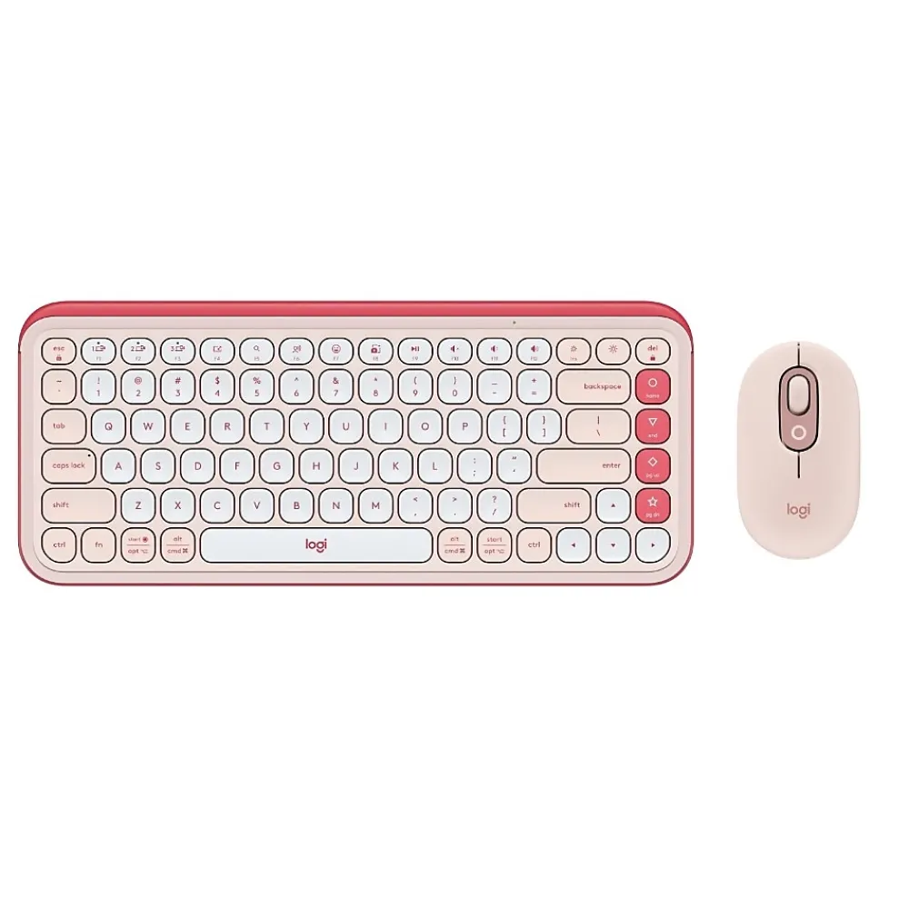 - Logitech POP ICON Wireless Keyboard Design is MINI with optical tracking mouse method. True color for this product is Rose and Off-White. Ideal for typing documents, browsing the web, and managing emails with ease. The customizable Action Keys allow quick access to frequently used applications and functions