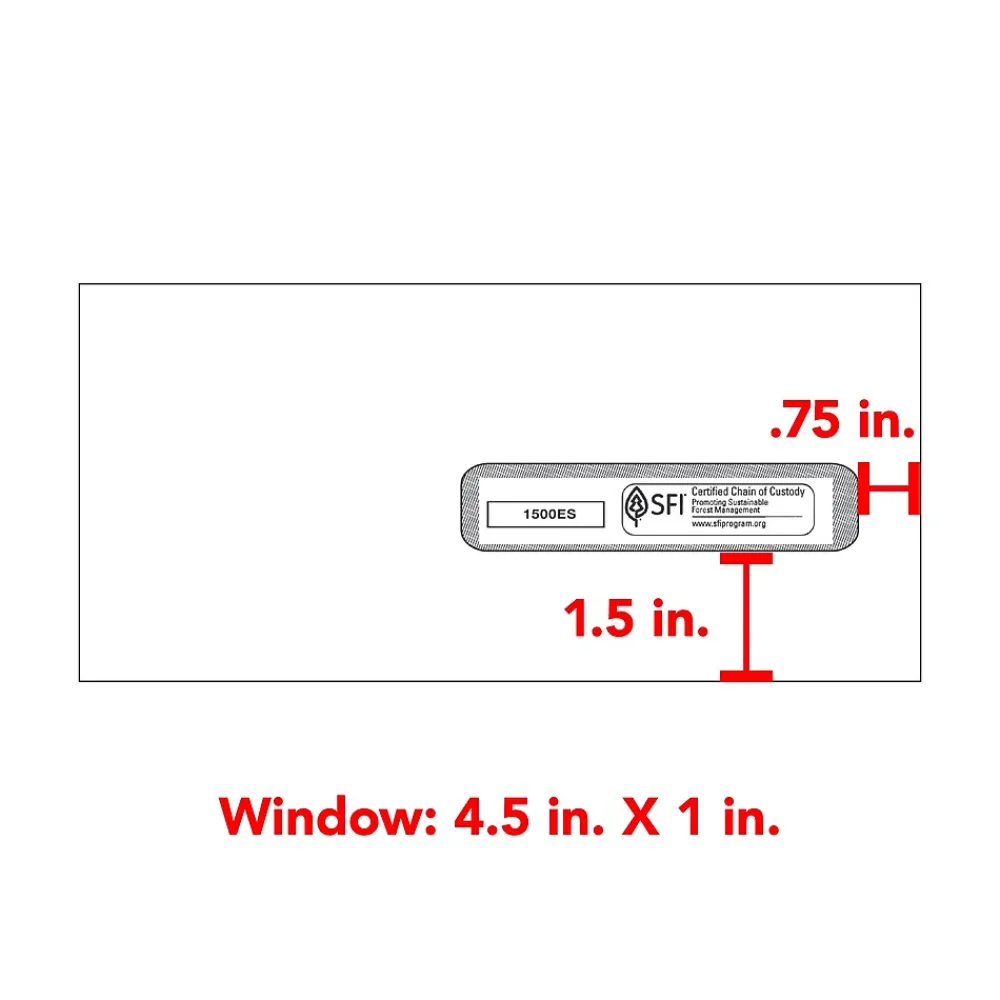 - Window size: 1×4-1/2″; window located 2″ from top of envelope, 5/8″ from right hand edge and 1-9/16″ from bottom