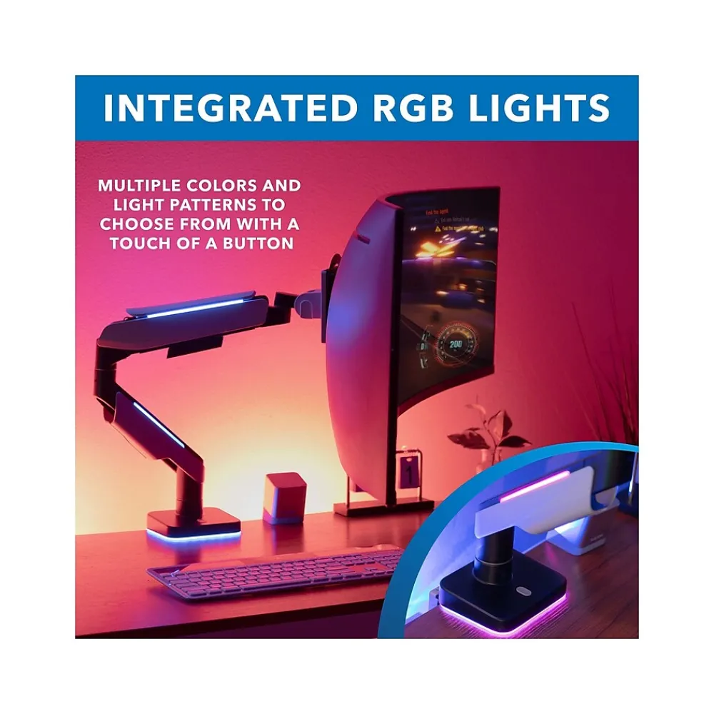 Create your perfect immersive gaming station or a professional multiscreen desk setup with this Mount-It! desk mount for monitors with screen size up to 49″ and weight up to 44 lbs., such as Samsung Odyssey G9 and LG 49″ UltraWide Dual QHD. The mount’s optimized heavy-duty tilting and gas spring mechanisms allow for smooth and stable adjustment of large screens. The full-motion design enables you to lower and raise, swivel, tilt, and rotate your screens to achieve the perfect viewing height and angle. To fully immerse in your game, this mount features RGB lighting along the arms and on the base: simply switch between 20 different modes by pressing the easily accessible RGB mode button on the base. Both, a clamp and grommet mount are included for easy installation on your desk. The detachable VESA plate with 75 x 75 and 100 x 100 hole patterns allows for quick installation of your monitors, and the integrated cable management ensures neat and organized cable routing along the arms.