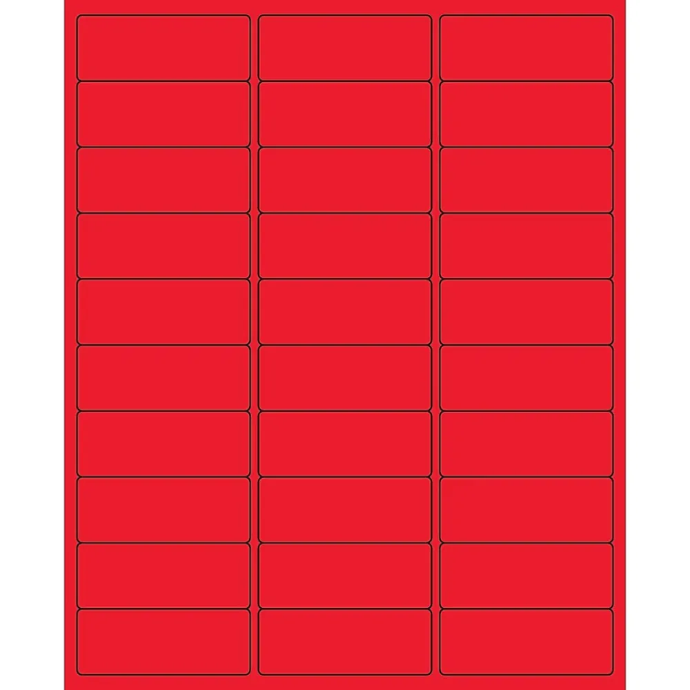 2 5/8″ x 1″ Fluorescent Red Rectangle Laser Labels. Use to create your own product or mailing labels. Labels work with both Laser and ink jet printers. Permanent adhesive. Labels stick to a variety of smooth surfaces including paper, corrugated, plastic, wood, glass and metal.