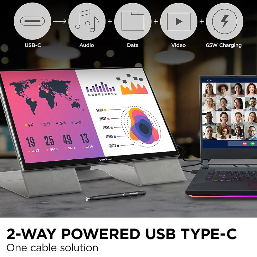 TD1656-2K is a portable 16” 16:10 monitor designed for optimal productivity on the go. Weighing less than 2lbs and under 0.5” thick, with an intuitive smart cover to both provide versatile viewing options and protect the screen in transit, this portable is optimized to take on the road. 10-point capacitive touch allows for intuitive screen control while 2K resolution offers vivid details for crispy and clear imagery. The two way power USB-C connectors provide a one-cable solution for multimedia transfer and 65W power charging, either receiving power from a laptop or power bank, or being able to pass through power to the connected device, when the portable is connected to a power source.