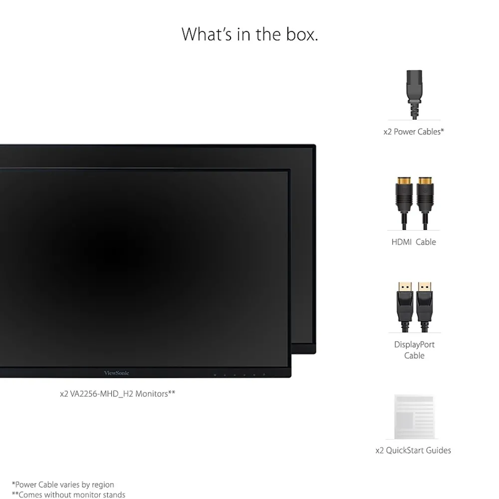 The ViewSonic VA2256-mhd_H2 dual monitor pack delivers an efficient end-to-end enterprise experience. From easy installation, to recycling, to long-term reliability, this dual monitor solution reduces the total cost of ownership beyond the initial purchase price. Sold as a dual pack of monitors without monitor stands, the VA2256-mhd_H2 ships in biodegradable packaging to minimize recycling costs and waste. Standard VESA-compatible mounting offers easy dual-screen installation, while a 3-sided thin bezel design provides a seamless viewing experience for multi-monitor setups. SuperClear IPS panel technology delivers wide-angle viewing and incredibly vivid colors. Extensive connectivity options include VGA, HDMI, and DisplayPort so that you can connect to a variety of HD and analog devices today and tomorrow.