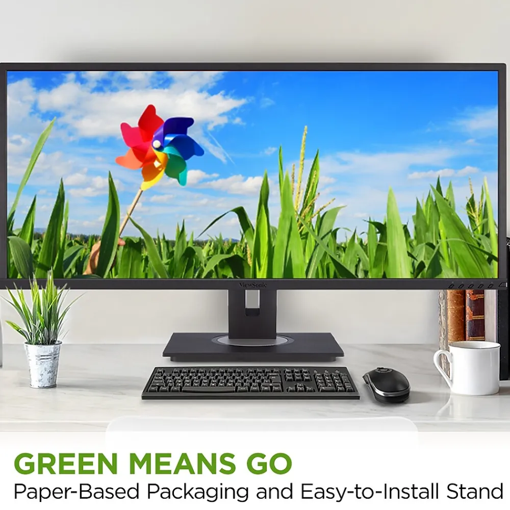Featuring an ultra-wide 34” screen with a design to boost productivity and maximize output, the ViewSonic VG3456A is a docking monitor that transforms your desktop into a streamlined and efficient workspace. With WQHD 3440 x 1440 resolution, the VG3456A delivers 2.4 times more pixels than standard Full HD monitors, giving users more detail for enhanced productivity. VG3456A provides an amazing Delta E<2 value and 100% sRGB color gamut for incredible and precise color accuracy. A 21:9 aspect ratio and slim bezels provide extra screen real estate so users can display more content, switch between applications more quickly, view documents side by side, and view multiple windows at once. Enjoy reliable and flexible network connectivity with the integrated gigabit Ethernet port while the latest USB Type-C connectivity provides up to 100W power delivery to your laptop. That’s not all, the integrated USB hub also provides single-cable simplicity for connecting and charging your peripherals and accessories. In addition, the included vDisplayManager software gives you quick and easy OSD control, as well as customized screen templates for easy multi-tasking. This monitor is also shipped in eco-friendly biodegradable packaging, along with an easy-to-install quick release stand that makes for quick deployment and a lower total cost of ownership.
